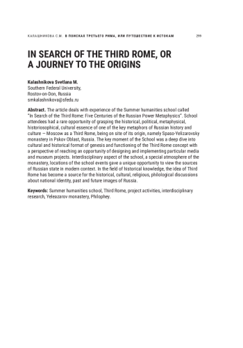 В статье рассматривается опыт проведения Летней гуманитарной школы «В поисках Третьего Рима: пять веков русской метафизики власти». Слушатели школы получили уникальную возможность постижения исторической, политической, метафизической, историософской, культурологической сути одной из ключевых метафор русской истории и культуры — формулы «Москва — Третий Рим» в месте ее возникновения, то есть в псковском Спасо-Елеазаровском монастыре. Особенностью прошедшей школы стал момент полного погружения участников школы: историков, филологов, реставраторов, журналистов и пиарщиков — в уникальный культурно-исторический формат генезиса и функционирования концепции Третьего Рима с проекцией выхода на формирование и внедрение конкретных проектов научно-просветительского, медийного и реставрационно-музейного характера. Междисциплинарная составляющая школы, особенная атмосфера пребывания в монастыре, а также локаций проведения мероприятий позволили участникам процесса совершенно по-новому взглянуть на истоки русской государственности в ее проекции на контекст современности. Генерируемая в поле исторического знания идея Третьего Рима в рамках лекций и мастер-классов стала источником культурологических, религиозных, искусствоведческих, филологических, журналистских споров и обсуждений идей национальной идентичности, точкой понимания и идентификации прошлого и будущего России.