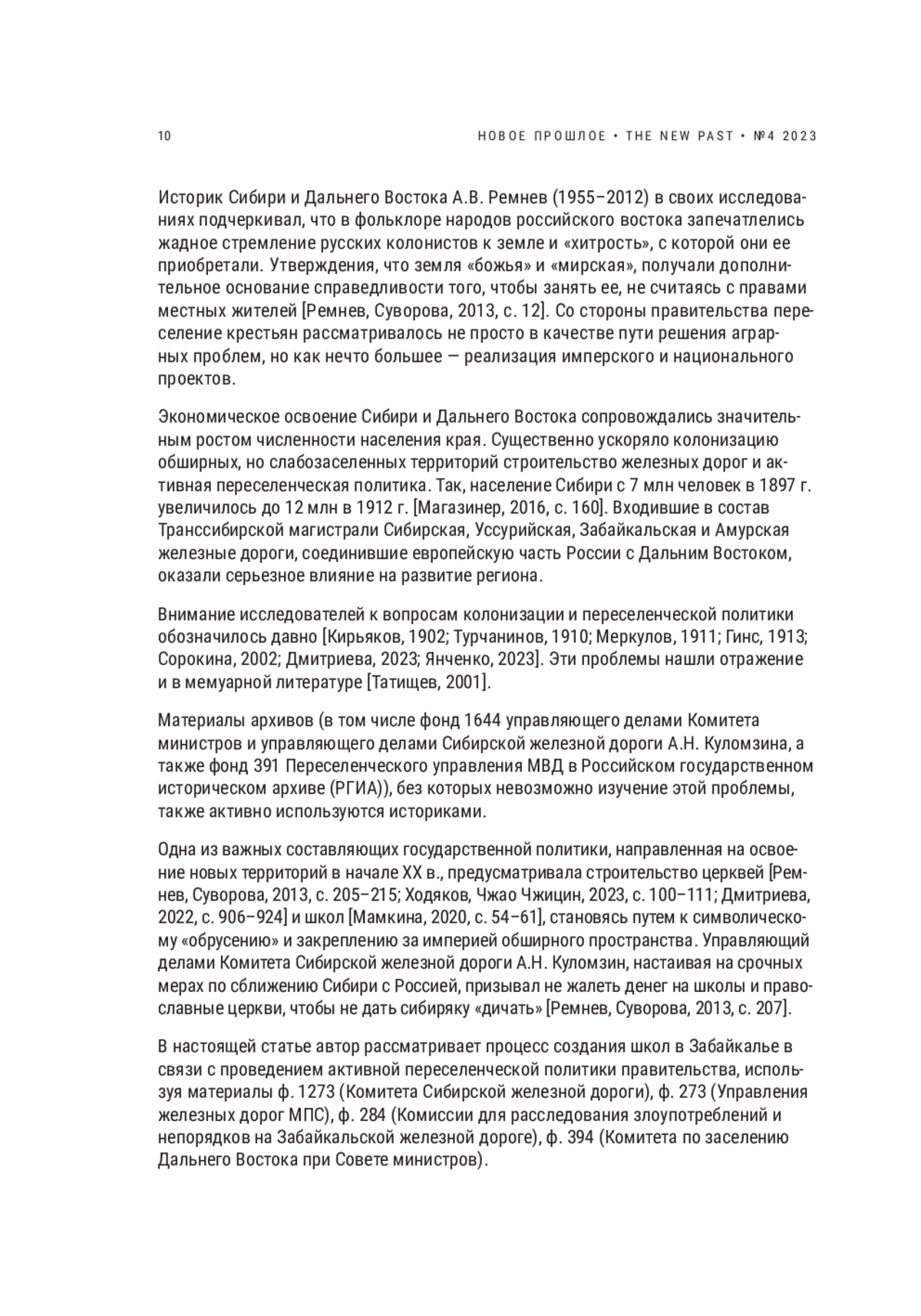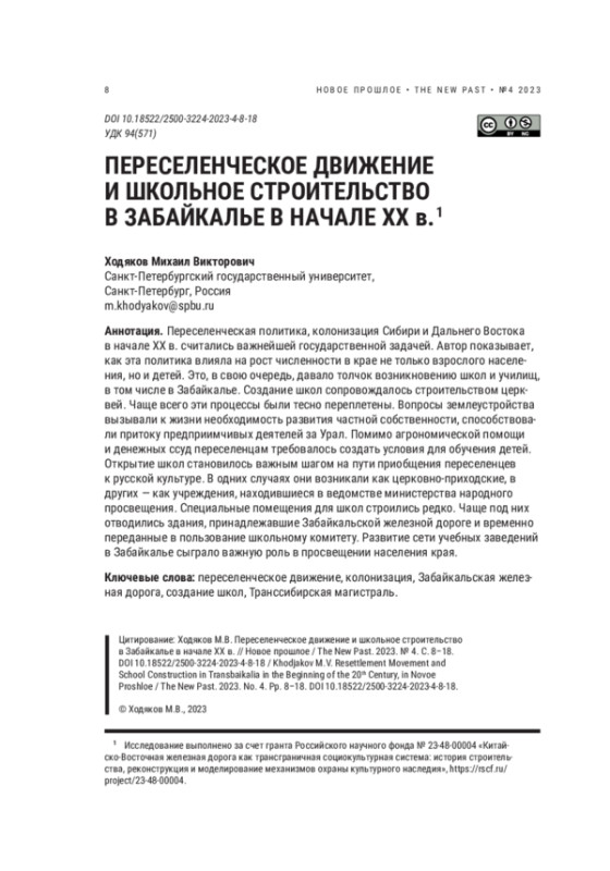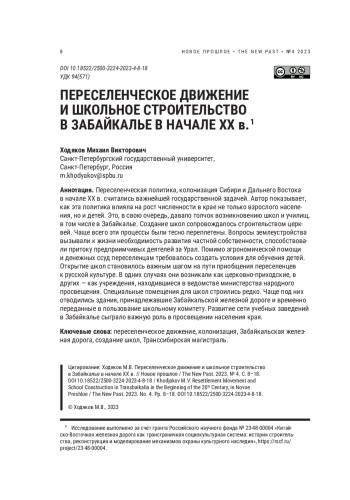 ХОДЯКОВ М. В. ПЕРЕСЕЛЕНЧЕСКОЕ ДВИЖЕНИЕ И ШКОЛЬНОЕ СТРОИТЕЛЬСТВО В ЗАБАЙКАЛЬЕ В НАЧАЛЕ ХХ В. // НОВОЕ ПРОШЛОЕ. 2023. № 4