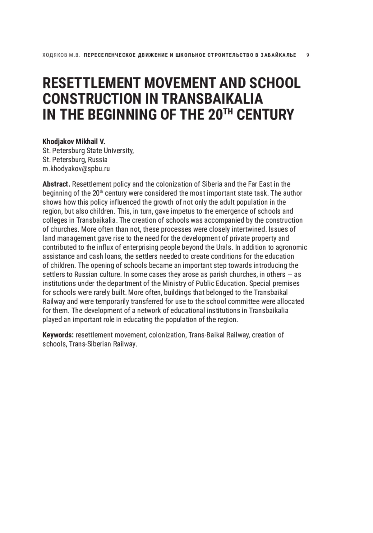 Статья: ПЕРЕСЕЛЕНЧЕСКОЕ ДВИЖЕНИЕ И ШКОЛЬНОЕ СТРОИТЕЛЬСТВО В ЗАБАЙКАЛЬЕ В НАЧАЛЕ ХХ В. (2023)