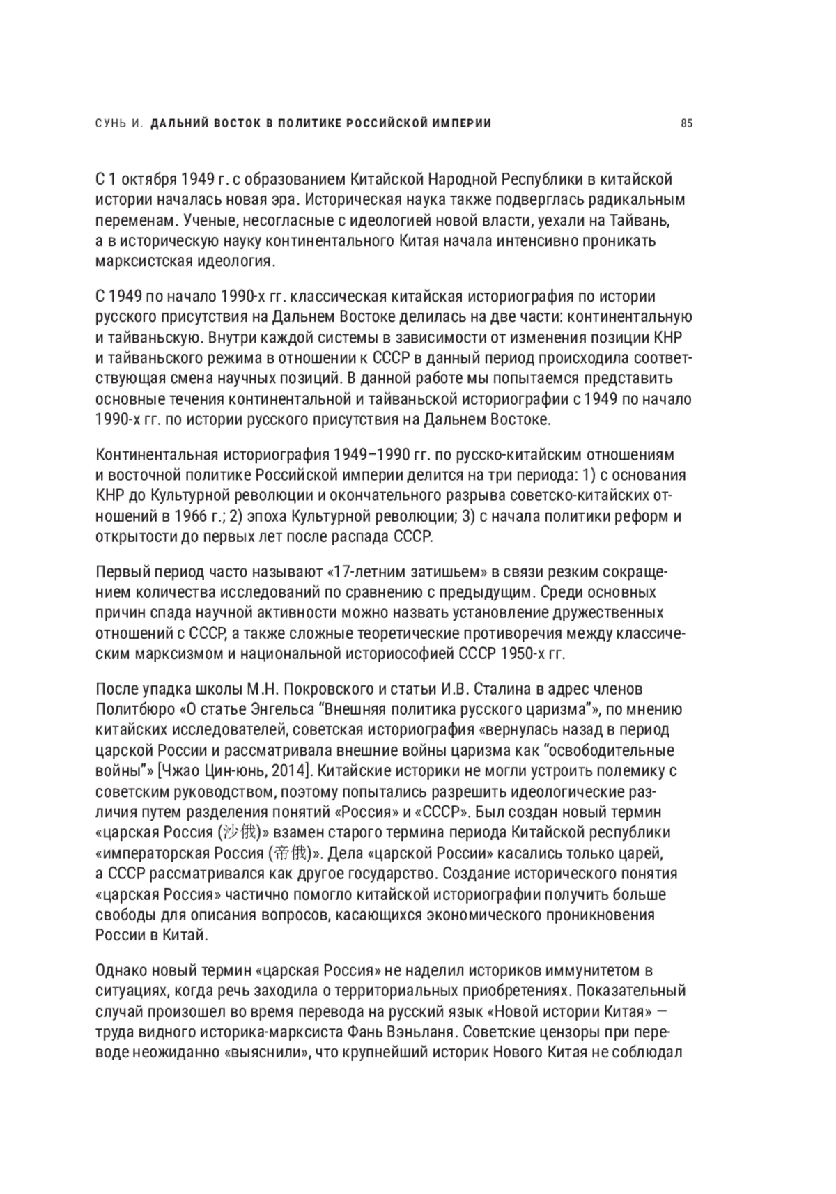 Статья представляет собой обобщение китайской историографии с 1949 по начало 1990-х гг. о присутствии Российской империи на Дальнем Востоке в конце XIX–начале XX в. После отступления армии Гоминьдана на Тайвань китайская историография разделилась на две части — континентальную и тайваньскую. По сравнению с предыдущим периодом развития, китайская историография второй половины XX в. отличалась крайней политизацией как на континенте, так и на Тайване. Второй особенностью, более характерной для континентальной историографии, является скудность источниковедческой базы. Лишь в 1980-х–начале 1990-х гг. источниковедческая ситуация улучшилась. Современные китайские историки часто описывают научную ситуацию второй половины XX в. фразеологизмом «проводить ритуалы внутри ракушки»: с одной стороны, ограничение в источниковедческом плане не позволило тогдашним историкам полноценно и всесторонне заниматься наукой, с другой стороны, они были гораздо энциклопедичнее и эрудированнее, чем современные коллеги, в связи с чем их работы нельзя считать полностью утратившими научную ценность