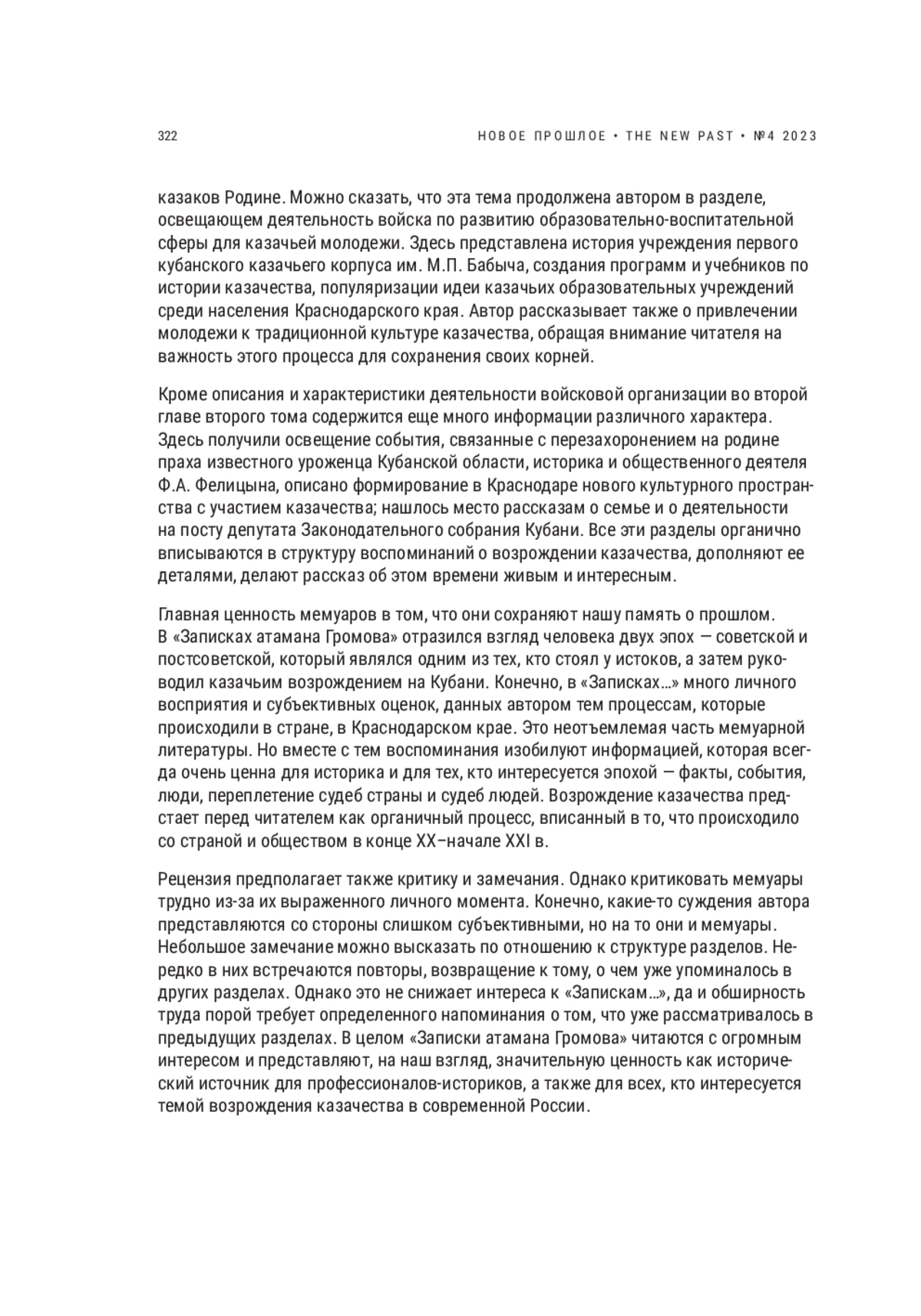 Статья является рецензией на книгу В. П. Громова «Записки атамана Громова» и представляет собой анализ замысла автора, структуры и состава информации «Записок…». Актуальность настоящей статьи обусловлена уникальностью рецензируемой книги: опубликованных воспоминаний участников возрождения немного. Рецензируемый труд представляет особый интерес, поскольку написавший его атаман, участник возрожденческого процесса, является еще и профессиональным историком. В связи с этим в мемуарах не только соблюдается хронологический порядок фактов и явлений, но и присутствует исследовательский момент в представлении тех или иных событий. В статье раскрывается структура томов «Записок атамана Громова», выявляются важнейшие идеи глав книги, показывается, как автор разворачивает картины позднесоветской и постсоветской эпох, включая в них казачество. Работа В. П. Громова насыщена информацией, позволяющей понять, как сохранялась казачья культура и идентичность в советский период, как происходила актуализация исторической памяти у потомков, как люди приходили в казачьи организации. Казачье возрождение на Кубани вплетено в социально-политические процессы Краснодарского края и Российского государства, связано культурными традициями с казачьей эмиграцией. Все это раскрывается через множество деталей, позволяющих понять специфику эпохи, в которой проходило возрождение казачества