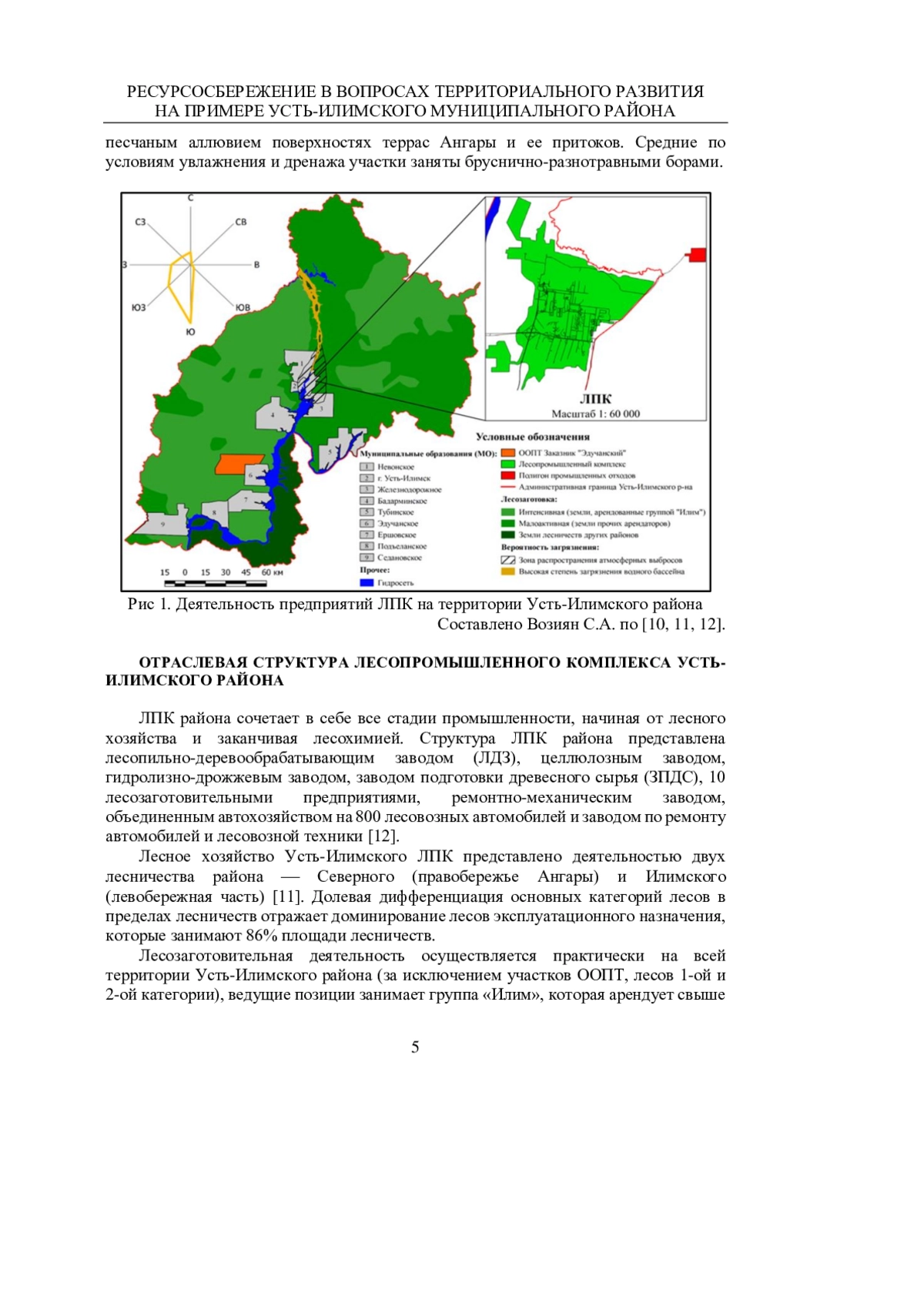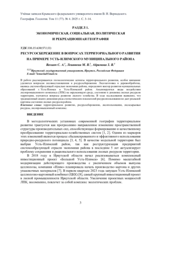 В работе рассматриваются геоэкологические аспекты территориального развития, особое внимание уделяется вопросам лесовосстановления и ресурсосбережения. Лесозаготовка и деревообработка, являясь системообразующей отраслью экономики района, определяют вектор развития муниципальных образований г. Усть-Илимск и Усть-Илимский район. Анализируются виды воздействия лесопромышленного комплекса (ЛПК) на окружающую среду, состояние и динамика лесных ресурсов территории, изучаются вопросы развития лесного хозяйства. В ходе исследования выявлено, что традиционный анализ динамики ряда статистических показателей ресурсопользования не дает реальной картины состояния лесных ресурсов района.