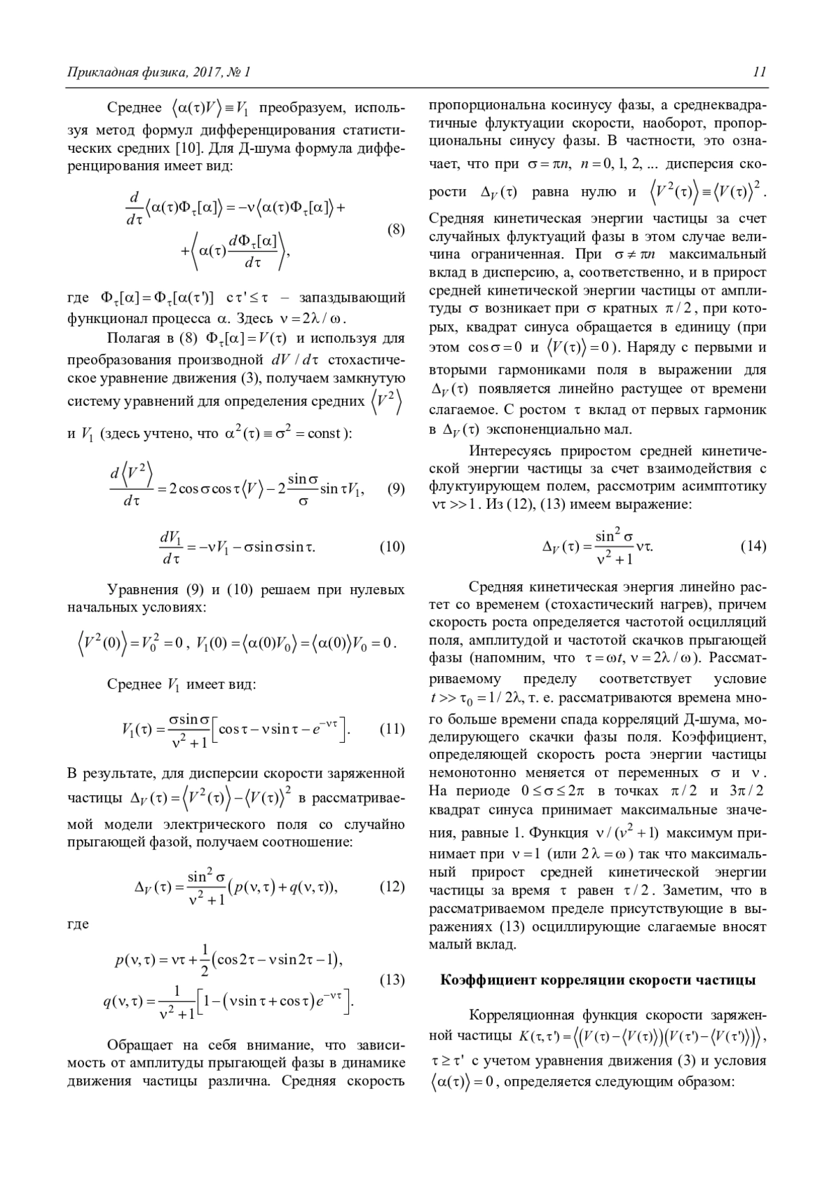 Исследована дисперсия скорости и координаты нерелятивистской заряженной частицы в осциллирующем электрическом поле со случайно прыгающей фазой в рамках точно решаемой модели, когда скачки фазы представляют собой случайный телеграфный сигнал. Показано, что есть область статистических характеристик фазы, где прирост средней кинетической энергии частицы линейно растет со временем (стохастический нагрев), а дисперсия частиц по координате на временах много больше времени спада корреляций, в отличие от классической диффузии, растет не как t, а как t 3 (супербаллистический режим диффузии). В том же пределе показано, что коэффициент корреляции скорости частицы спадает как 1 / t. Выписана система уравнений в частных производных для определения распределения скорости частицы.