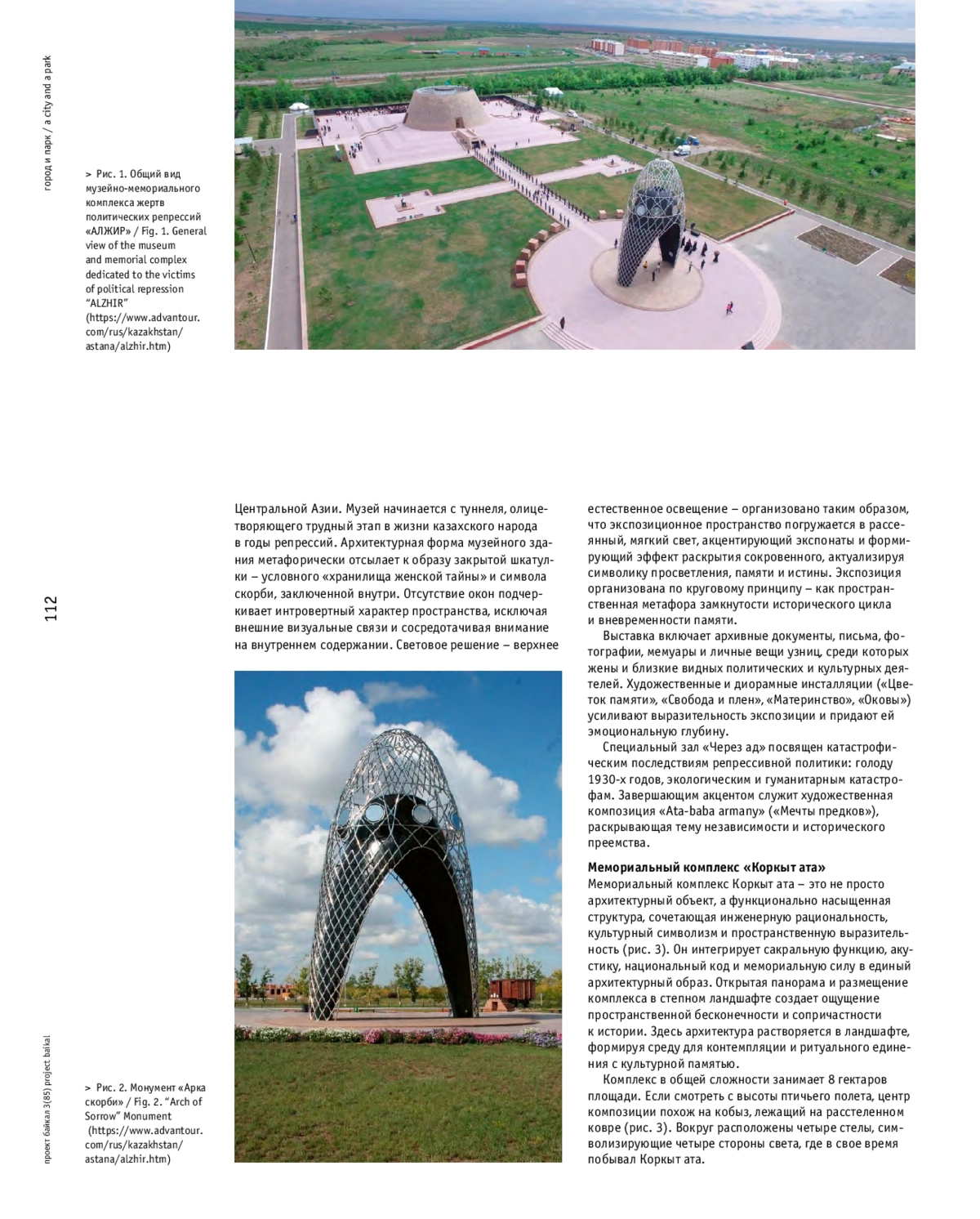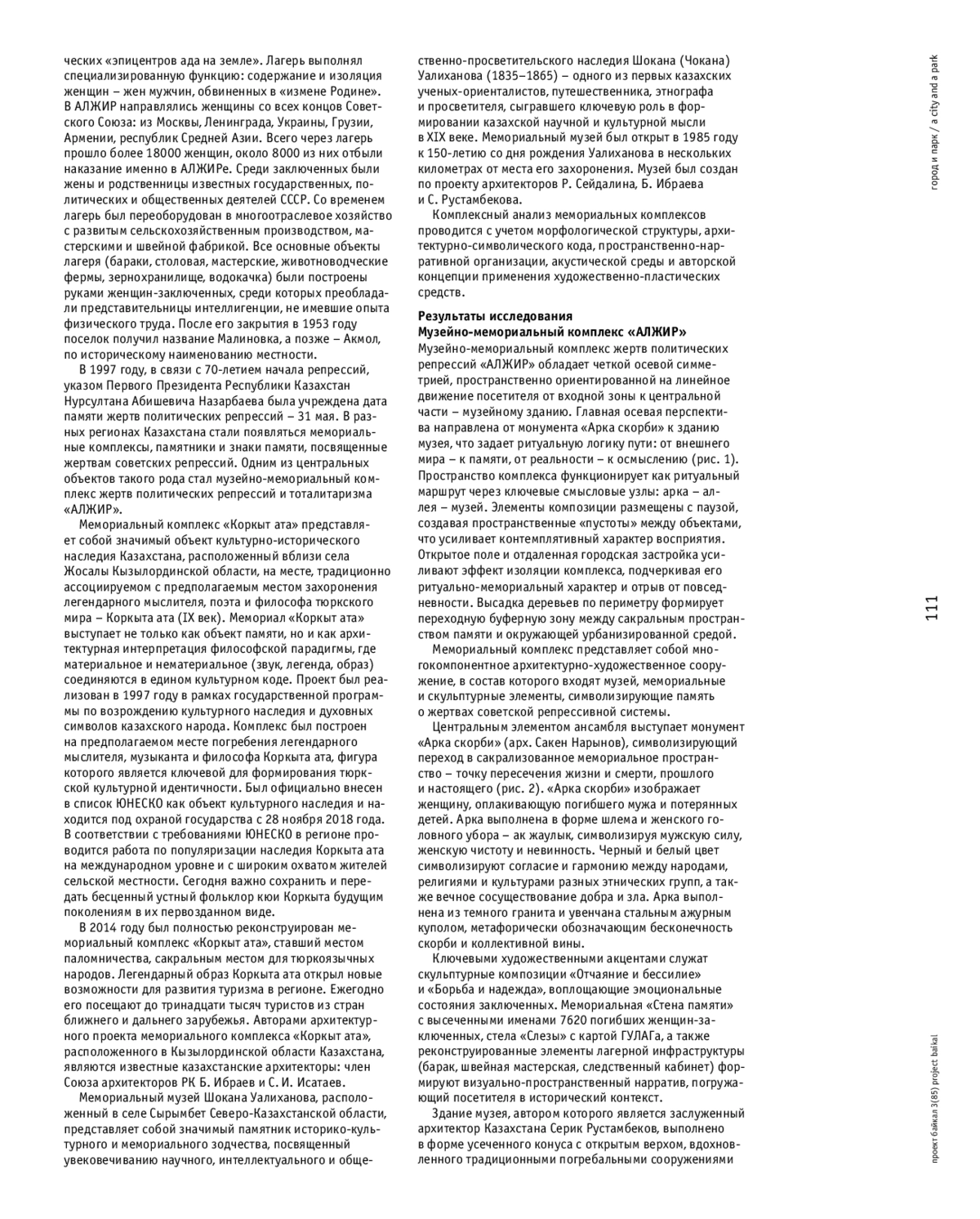 В статье исследуется архитектура трех знаковых мемориальных комплексов Казахстана, ставших символами региональной идентичности и носителями коллективной памяти. Цель работы - проанализировать архитектурные решения, определяющие образ и семантику этих объектов. В качестве методов использован комплексный анализ литературных источников и визуальных материалов для изучения формы, композиции и декоративного оформления ключевых элементов: монументальных групп, стел, арок, лестниц и ритуальных площадок. Результаты показывают, что семантический подход позволяет глубже раскрыть симво лическое содержание архитектурного образа и понять его роль в формировании и поддержании культурной идентичности общества.