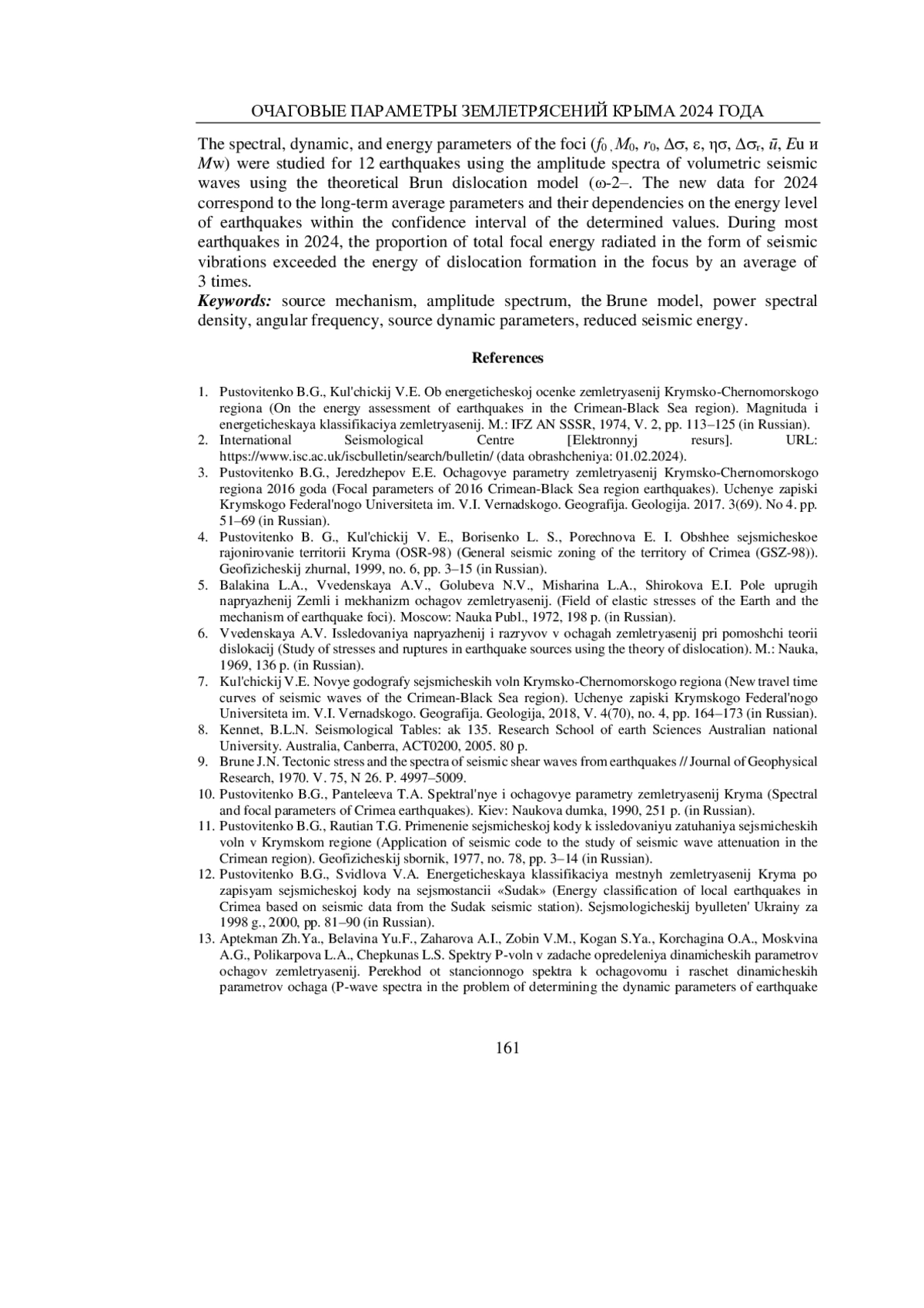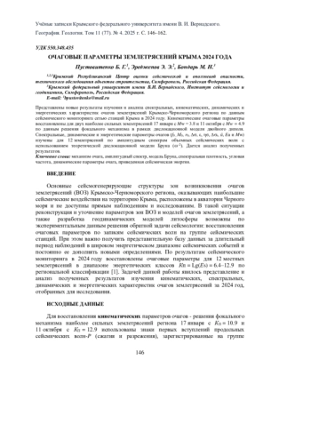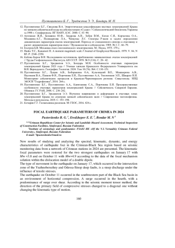 17. Пустовитенко Б.Г., Эреджепов Э.Э., Бондарь М.Н. Особенности очаговых параметров землетрясений Крыма 2023 года // Ученые записки Крымского Федерального Университета им В.И. Вернадского. География. Геология. 2024. Том 10 (76). №4. С.130-151.