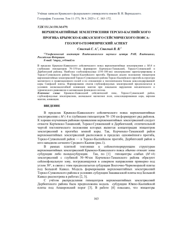 В пределах Крымско-Кавказского сейсмического пояса верхнемантийные землетрясения с М ≤4 и глубинами гипоцентров 70-150 км формируют Керченско-Таманский, Терско-Сунженский и Дербентский районы. Наиболее глубокофокусные (150-180 км) землетрясения зарегистрированы в Терско-Сунженском районе Терско-Каспийского прогиба. Проведен анализ положения эпицентров верхнемантийных землетрясений Терско-Сунженского района Терско-Каспийского прогиба в структуре магнитного и гравитационного полей и по отношению к тектоническим блокам консолидированной коры Скифской плиты. Формирование очагов глубокофокусных землетрясений предполагается в условиях мелкомасштабной конвекции мантии при локальном нарушении механического и термического равновесия и активизации флюидного потока.