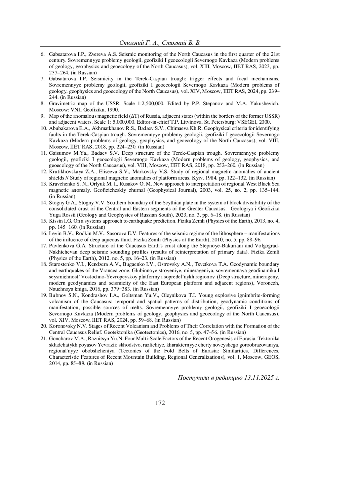 14. Стогний Г.А., Стогний В.В. Южная граница Скифской плиты в системе блоковой делимости консолидированной коры Центрального и Восточного сегментов Большого Кавказа // Геология и Геофизика Юга России. 2023. №3. С. 6-18.