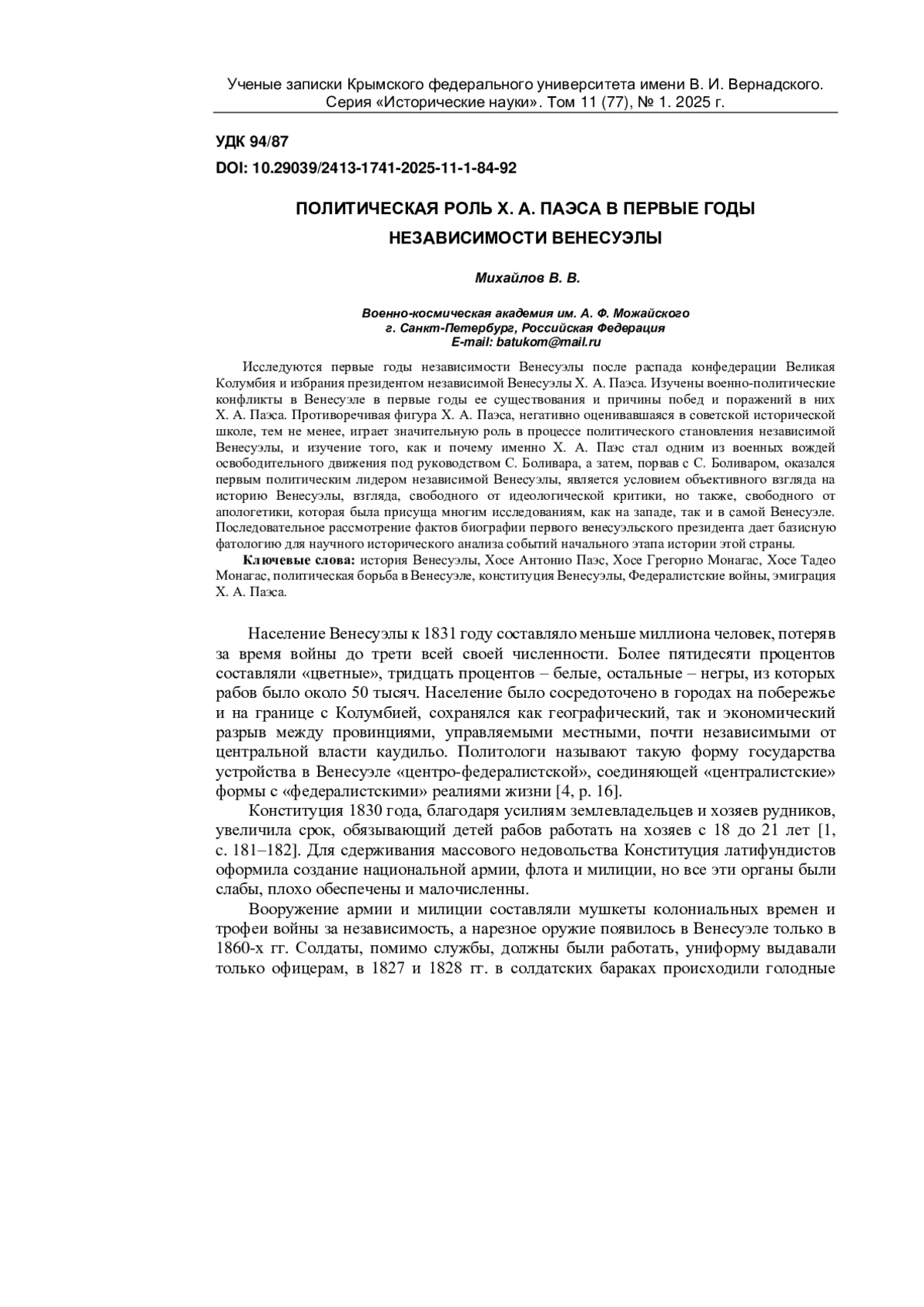 Исследуются первые годы независимости Венесуэлы после распада конфедерации Великая Колумбия и избрания президентом независимой Венесуэлы Х. А. Паэса. Изучены военно-политические конфликты в Венесуэле в первые годы ее существования и причины побед и поражений в них Х. А. Паэса. Противоречивая фигура Х. А. Паэса, негативно оценивавшаяся в советской исторической школе, тем не менее, играет значительную роль в процессе политического становления независимой Венесуэлы, и изучение того, как и почему именно Х. А. Паэс стал одним из военных вождей освободительного движения под руководством С. Боливара, а затем, порвав с С. Боливаром, оказался первым политическим лидером независимой Венесуэлы, является условием объективного взгляда на историю Венесуэлы, взгляда, свободного от идеологической критики, но также, свободного от апологетики, которая была присуща многим исследованиям, как на западе, так и в самой Венесуэле. Последовательное рассмотрение фактов биографии первого венесуэльского президента дает базисную фатологию для научного исторического анализа событий начального этапа истории этой страны.