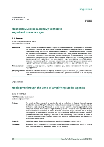 Целью данного исследования является изучение роли неологизмов в формировании установления медийной повестки дня. На основе источников англоязычного и русскоязычного медийного дискурса выделены лексические образования, относящиеся к сфере криптоиндустрии и цифровых финансов и образованные с помощью морфемы -coin / -коин, а также неологизмы в области цифровых технологий, среди которых термин «фиджитал». В медиадискурсе неологизмы используются медиатехнологами с целью формировании общественного мнения и осмыслении социальных явлений через призму уже сложившейся у аудитории картины мира. Посредством создания смыслового фрейма с помощью неологизмов происходит усвоение новых смыслов через определенные установки, которые способствуют усилению медийной повестки дня.