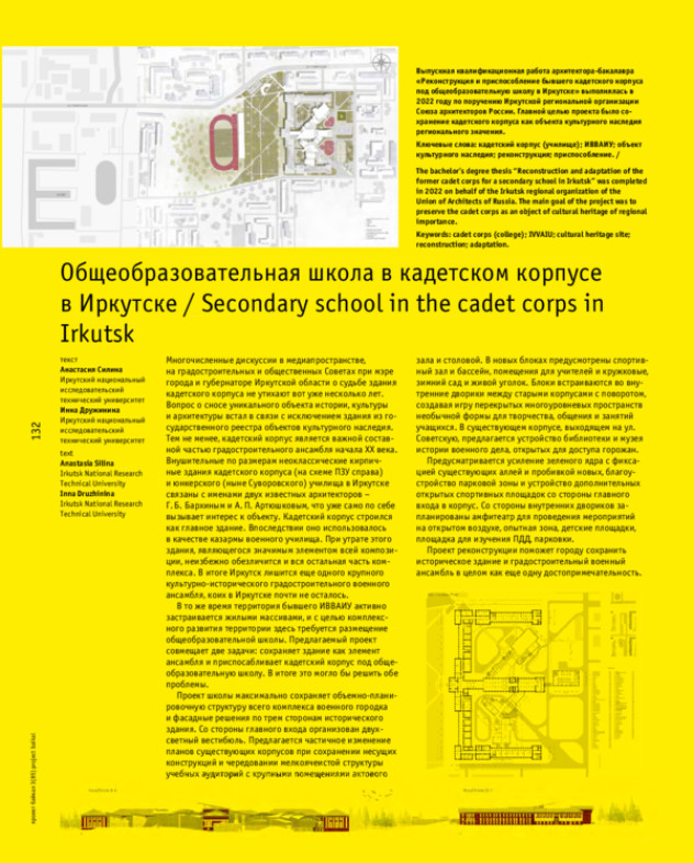Выпускная квалификационная работа архитектора-бакалавра «Реконструкция и приспособление бывшего кадетского корпуса под общеобразовательную школу в Иркутске» выполнялась в 2022 году по поручению Иркутской региональной организации Союза архитекторов России. Главной целью проекта было сохранение кадетского корпуса как объекта культурного наследия регионального значения.