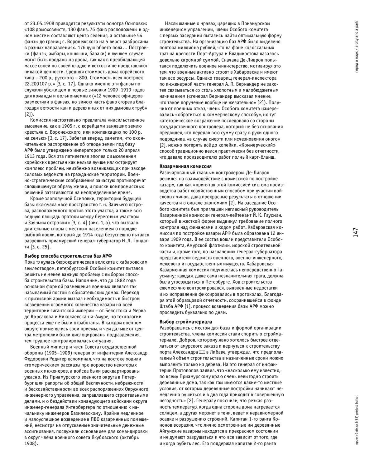 В статье представлены промежуточные результаты исследования «Военная тема в архитектурно-пространственном освоении Дальнего Востока», проводимого в рамках гранта Российского научного фонда. Основная часть исследования посвящена организации базы Амурской речной флотилии в Осиповском затоне под Хабаровском (1908-1918). На примере этого частного случая рассматривается ряд вопросов, связанных с пространственной и социальной иерархией военных городков, эффективностью войсковых строительных комиссий, проблемами поиска качественных стройматериалов, с адаптацией «буржуазных» проектов к особенностям экипажной жизни. Высказывается предположение о влиянии И. С. Китнера на формирование кирпичного гарнизонного стиля.