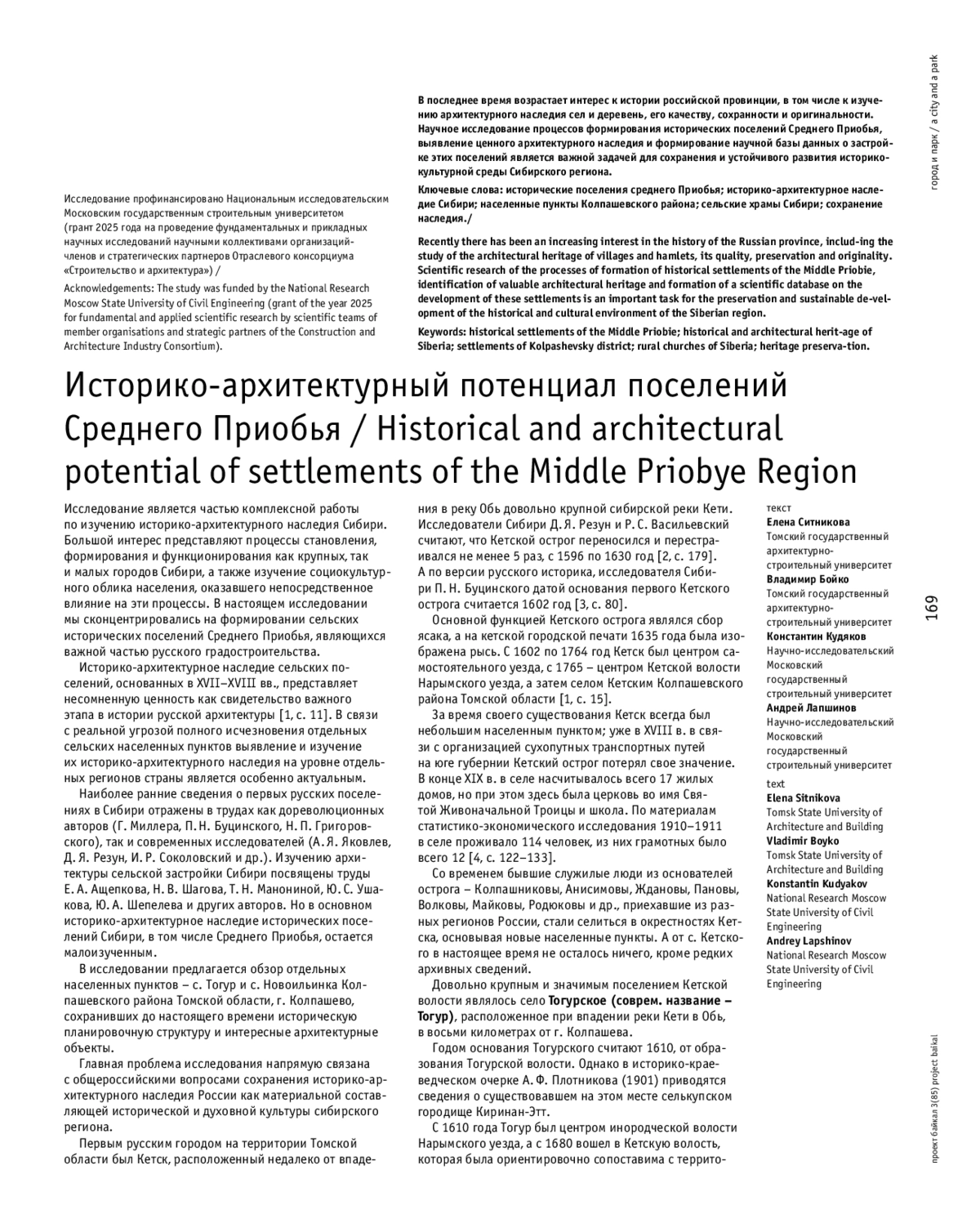 В последнее время возрастает интерес к истории российской провинции, в том числе к изуче- нию архитектурного наследия сел и деревень, его качеству, сохранности и оригинальности. Научное исследование процессов формирования исторических поселений Среднего Приобья, выявление ценного архитектурного наследия и формирование научной базы данных о застрой- ке этих поселений является важной задачей для сохранения и устойчивого развития историко- культурной среды Сибирского региона.