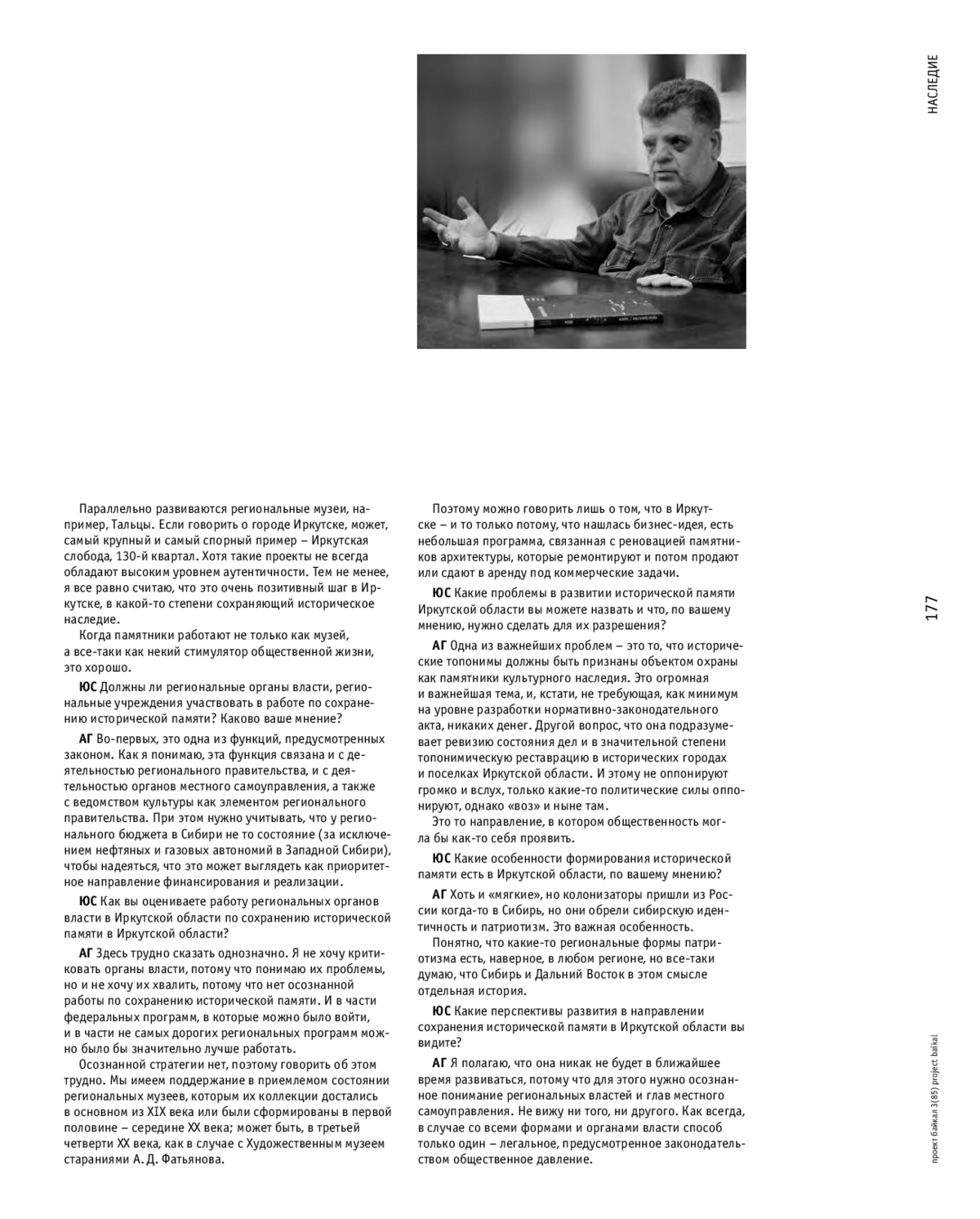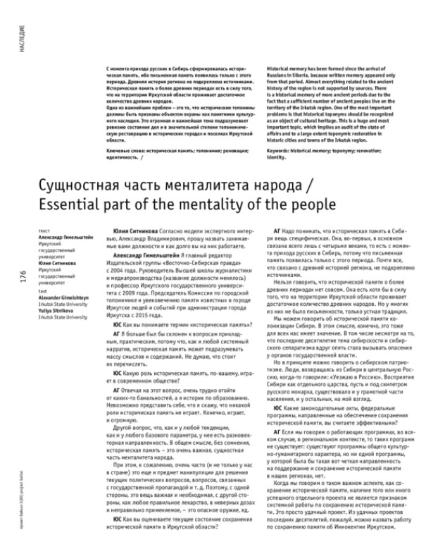 С момента прихода русских в Сибирь сформировалась историческая память, ибо письменная память появилась только с этого периода. Древняя история региона не подкреплена источниками. Историческая память о более древних периодах есть в силу того, что на территории Иркутской области проживает достаточное количество древних народов. Одна из важнейших проблем - это то, что исторические топонимы должны быть признаны объектом охраны как памятники культурного наследия. Это огромная и важнейшая тема подразумевает ревизию состояния дел и в значительной степени топонимическую реставрацию в исторических городах и поселках Иркутской области