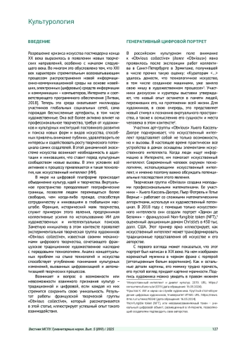 Активное накопление цифровых артефактов в современном искусстве способствует развитию творческого и исследовательского потенциала. Особенно это заметно в контексте интеграции искусственного интеллекта и художественного процесса. С целью изучения влияния новых технологий на традиционные художественные практики и концепции авторства проведен анализ работ французской художественной группы «Obvious Collective», использующей инновационные инструменты для создания своих произведений. Применение культурологического и философского анализа творческого направления позволило глубже понять концептуальные проблемы, возникающие на стыке технологий и искусства. Результаты исследования показывают, что использование искусственного интеллекта не только меняет роль художника, но и ставит под сомнение традиционные представления об оригинальности и авторстве произведений искусства.