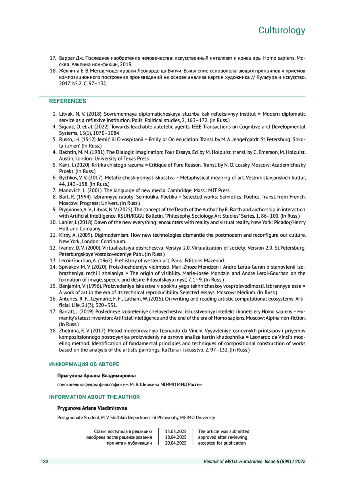 9. Прыгунова А. В., Литвак Н. В. Концепция “Смерть автора” Р. Барта и авторство во взаимодействии с искусственным интеллектом // Вестник РГГУ. Серия “Философия. Социология. Искусствоведение”. 2025. № 1. С. 86-100. EDN: OYOWSQ