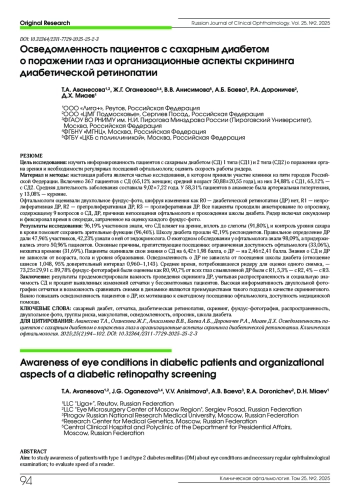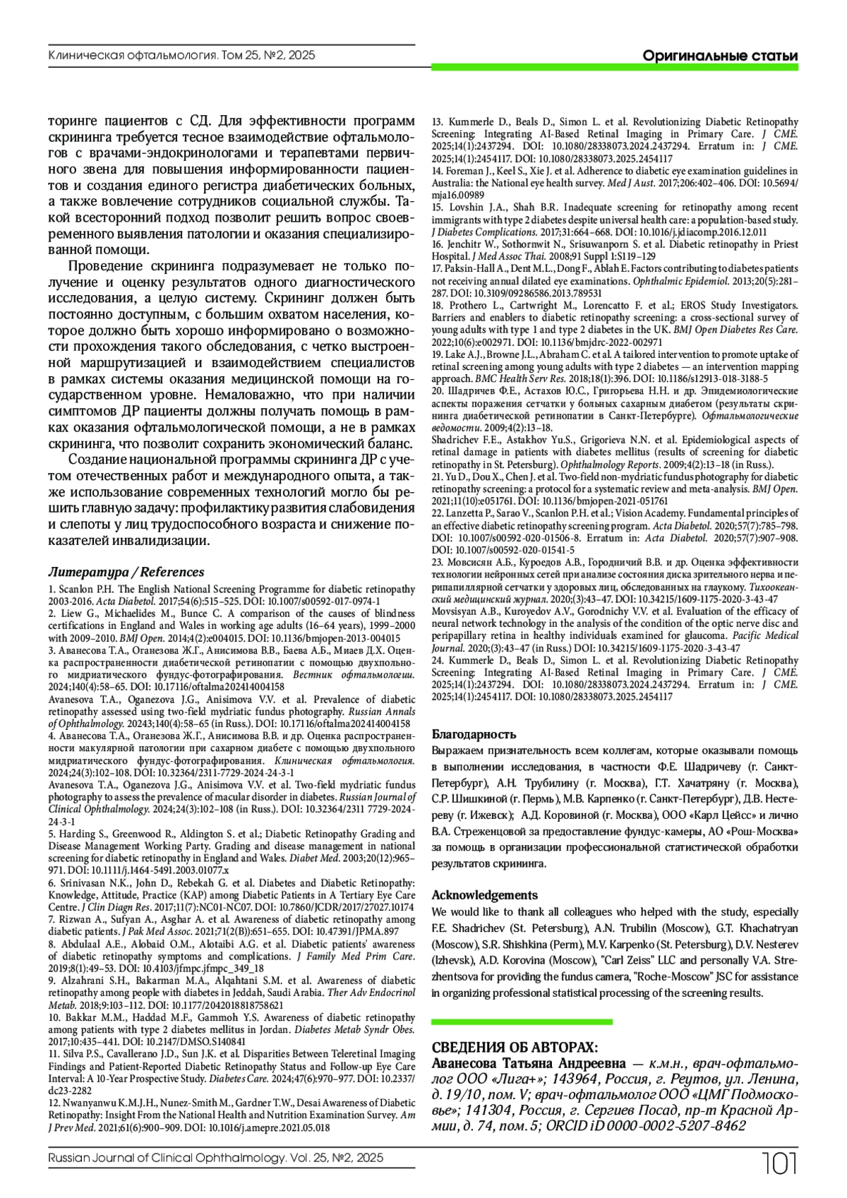 Заключение: результаты продемонстрировали важность проведения скрининга ДР, учитывая распространенность и социальную значимость СД и процент выявленных изменений сетчатки у бессимптомных пациентов. Высокая информативность двухпольной фотографии сетчатки и возможность сравнивать снимки в динамике являются преимуществами такого подхода в качестве скринингового. Важно повышать осведомленность пациентов о ДР, их мотивацию к ежегодному посещению офтальмолога, доступность медицинской помощи.