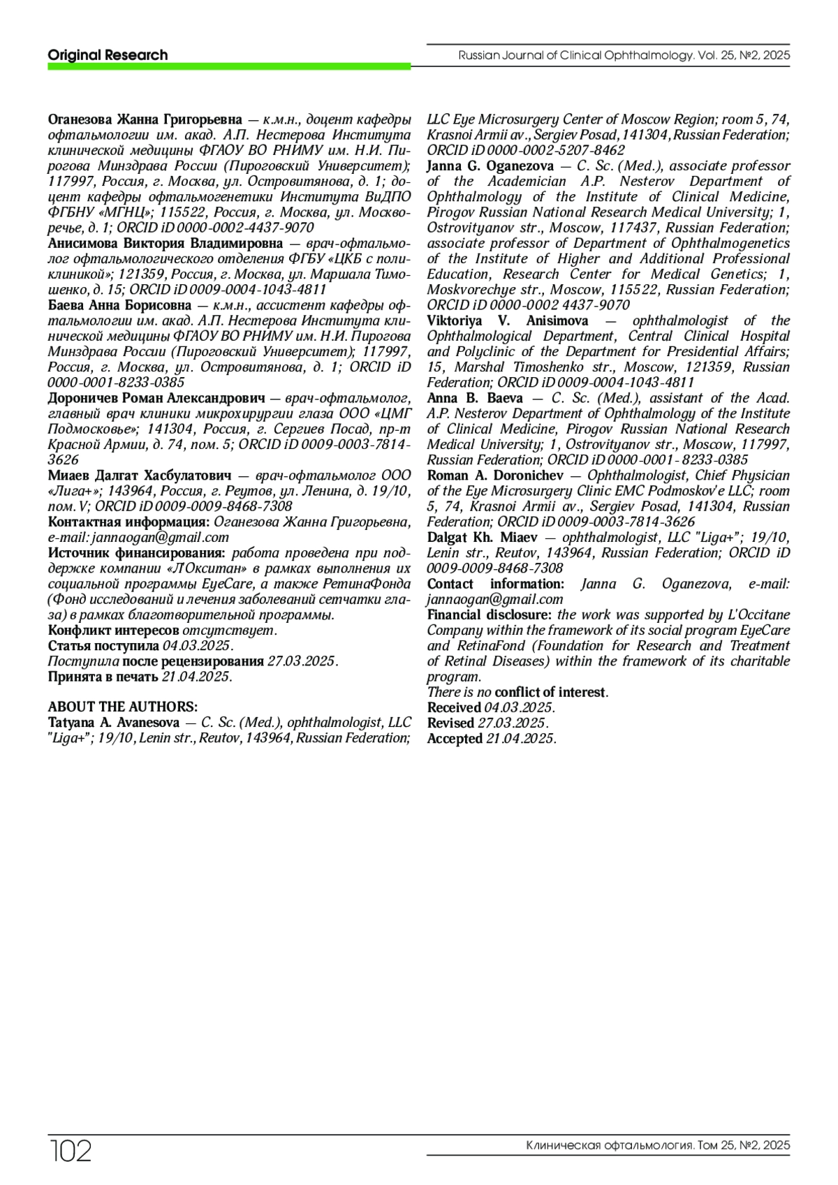 4. Аванесова Т.А., Оганезова Ж.Г., Анисимова В.В. и др. Оценка распространенности макулярной патологии при сахарном диабете с помощью двухпольного мидриатического фундус-фотографирования. Клиническая офтальмология. 2024;24(3):102-108. DOI: 10.32364/2311-7729-2024-24-3-1