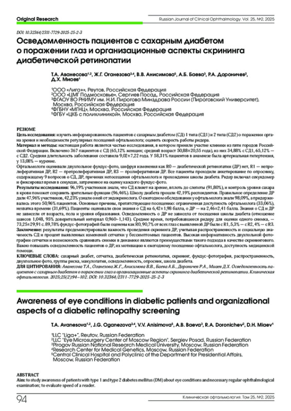 3. Аванесова Т.А., Оганезова Ж.Г., Анисимова В.В., Баева А.Б., Миаев Д.Х. Оценка распространенности диабетической ретинопатии с помощью двухпольного мидриатического фундус-фотографирования. Вестник офтальмологии. 2024;140(4):58-65. DOI: 10.17116/oftalma202414004158