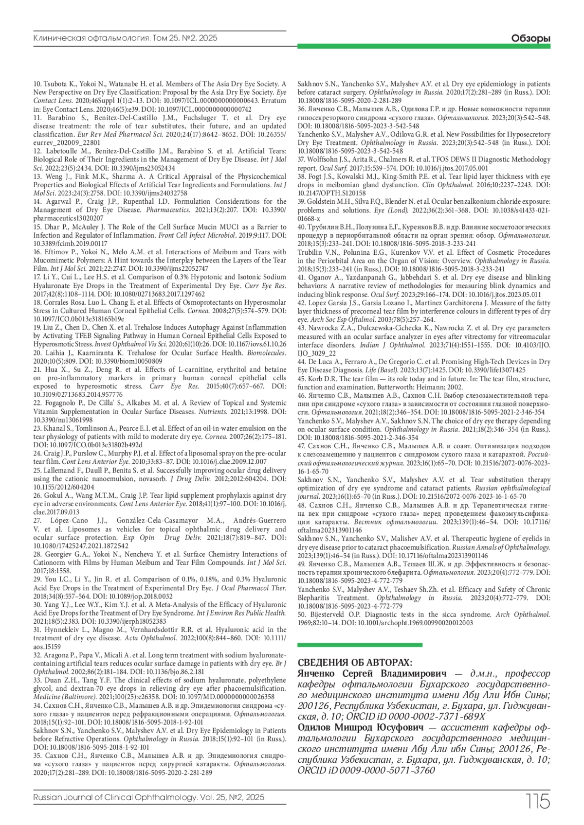 36. Янченко С.В., Малышев А.В., Одилова Г.Р. и др. Новые возможности терапии гипосекреторного синдрома “сухого глаза”. Офтальмология. 2023;20(3):542-548. DOI: 10.18008/1816-5095-2023-3-542-548