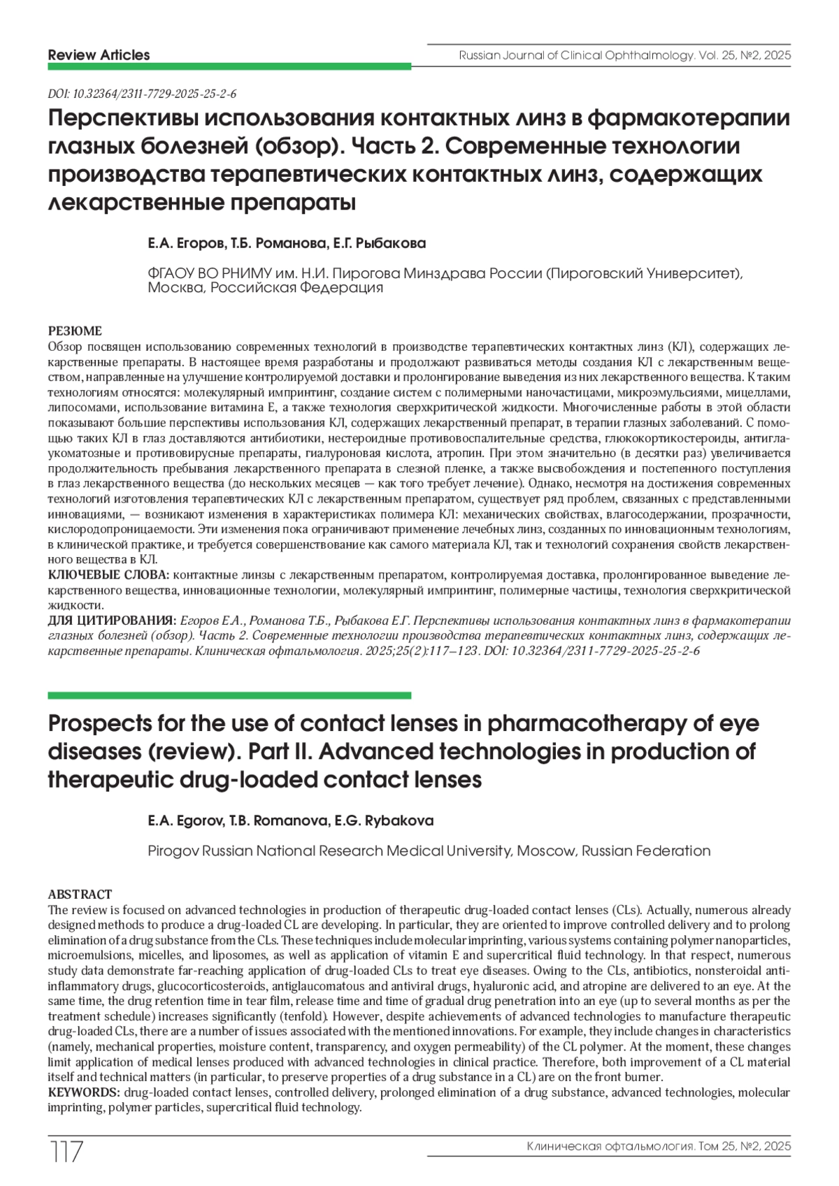 Обзор посвящен использованию современных технологий в производстве терапевтических контактных линз (КЛ), содержащих лекарственные препараты. В настоящее время разработаны и продолжают развиваться методы создания КЛ с лекарственным веществом, направленные на улучшение контролируемой доставки и пролонгирование выведения из них лекарственного вещества. К таким технологиям относятся: молекулярный импринтинг, создание систем с полимерными наночастицами, микроэмульсиями, мицеллами, липосомами, использование витамина Е, а также технология сверхкритической жидкости. Многочисленные работы в этой области показывают большие перспективы использования КЛ, содержащих лекарственный препарат, в терапии глазных заболеваний. С помощью таких КЛ в глаз доставляются антибиотики, нестероидные противовоспалительные средства, глюкокортикостероиды, антиглаукоматозные и противовирусные препараты, гиалуроновая кислота, атропин. При этом значительно (в десятки раз) увеличивается продолжительность пребывания лекарственного препарата в слезной пленке, а также высвобождения и постепенного поступления в глаз лекарственного вещества (до нескольких месяцев — как того требует лечение). Однако, несмотря на достижения современных технологий изготовления терапевтических КЛ с лекарственным препаратом, существует ряд проблем, связанных с представленными инновациями, — возникают изменения в характеристиках полимера КЛ: механических свойствах, влагосодержании, прозрачности, кислородопроницаемости. Эти изменения пока ограничивают применение лечебных линз, созданных по инновационным технологиям, в клинической практике, и требуется совершенствование как самого материала КЛ, так и технологий сохранения свойств лекарственного вещества в КЛ.