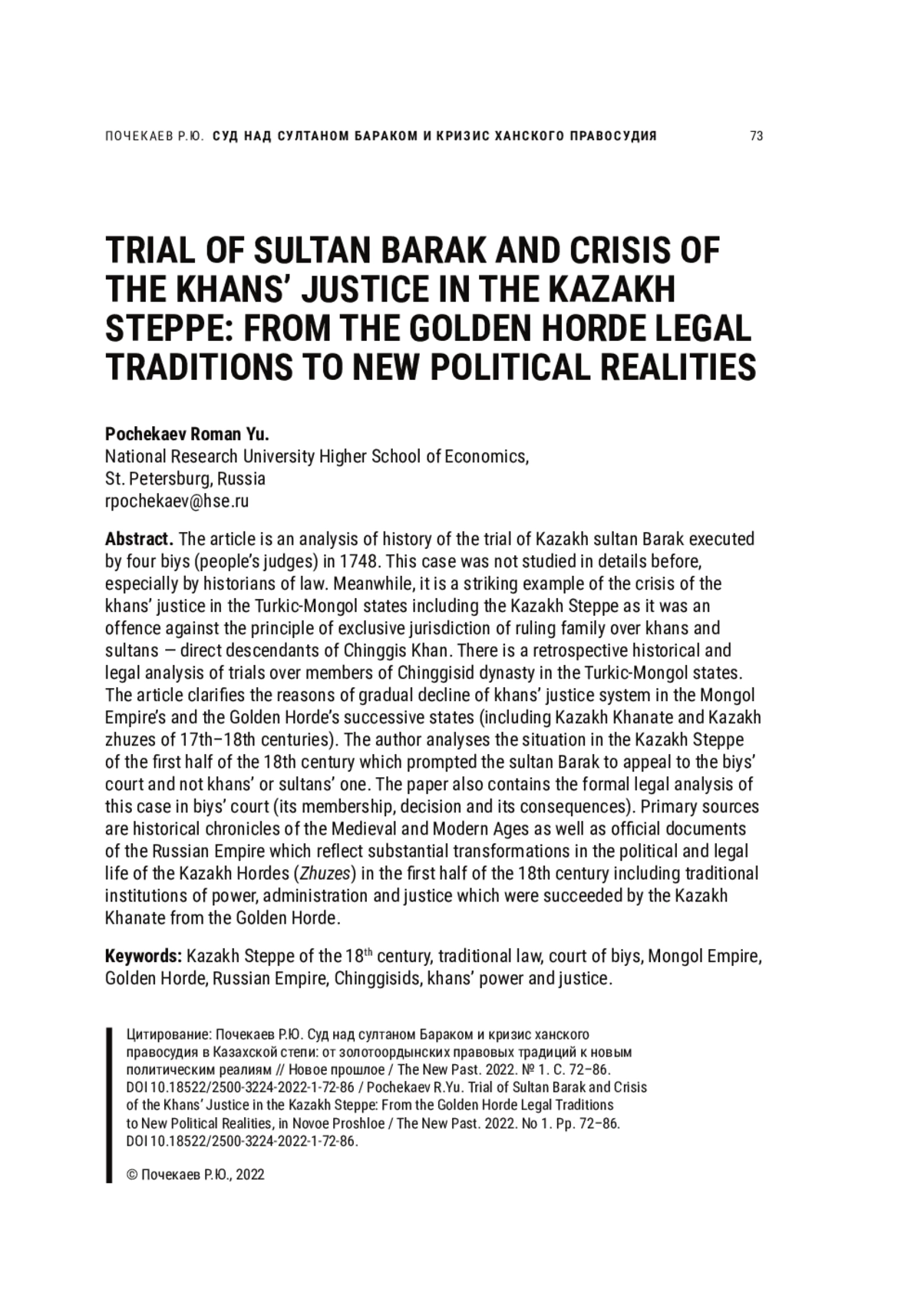 В статье анализируется история суда над казахским султаном Бараком, осуществленного четырьмя народными судьями — биями (1748 г.). Этот суд представляется весьма ярким примером кризиса ханского правосудия в тюрко-монгольских государствах, и в Казахской степи в частности, поскольку в его рамках был нарушен принцип рассмотрения дел ханов и султанов (прямых потомков Чингис-хана) только членами ханского же рода. В статье проводится ретроспективный историко-правовой анализ судебных процессов над членами рода Чингизидов в тюрко-монгольских государствах, а также выявляются причины постепенного упадка системы имперских судов в государствах — наследниках Монгольской империи и Золотой Орды, в т. ч. в Казахском ханстве и казахских жузах в XVII–XVIII вв. Источниками исследования выступают исторические хроники и летописи Средних веков и Нового времени, а также российская имперская официальная документация, отражающая существенные изменения в политической и правовой жизни в казахских жузах первой половины XVIII в., в т. ч. традиционных институтов власти, управления и суда, унаследованных Казахским ханством от Золотой Орды