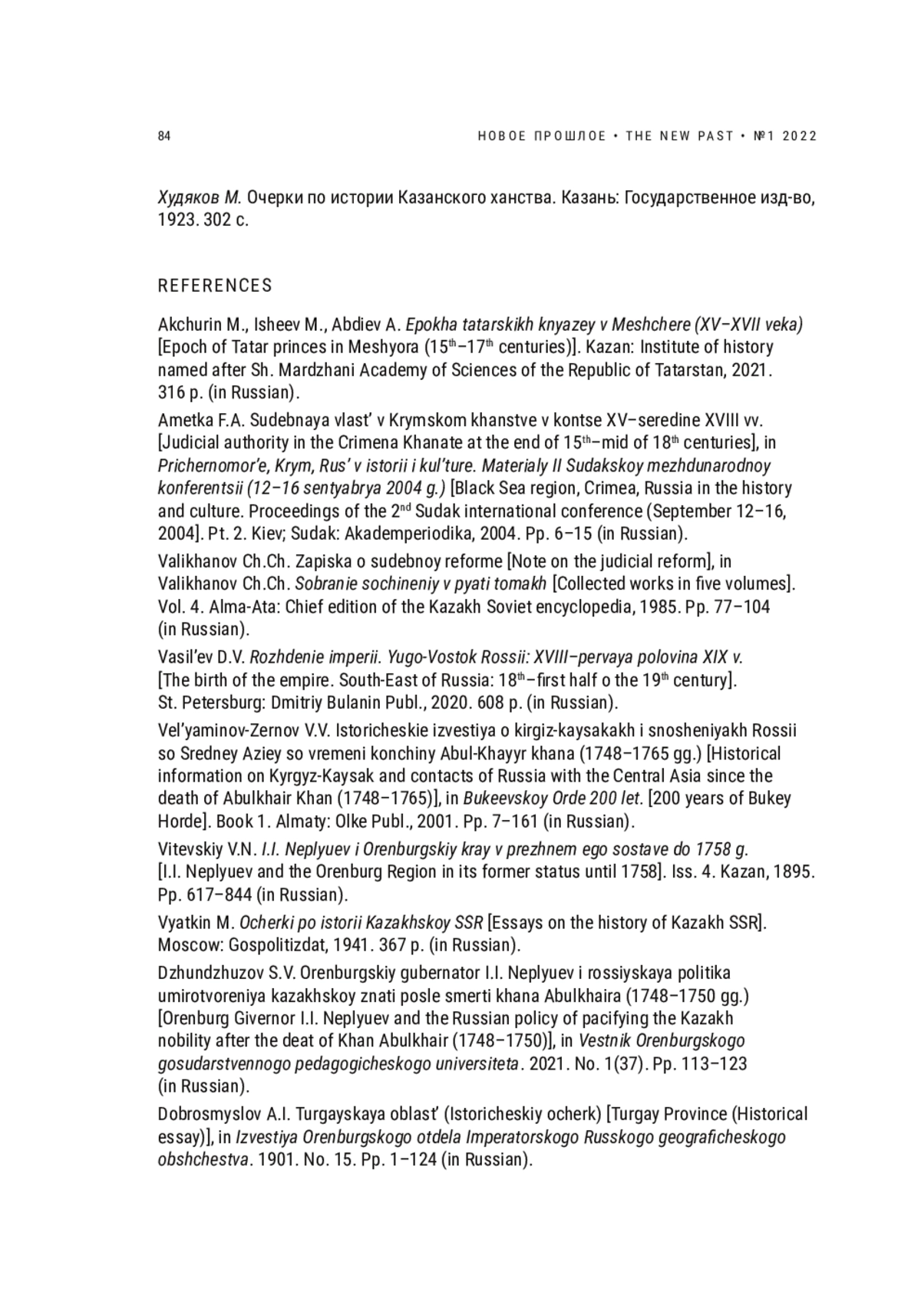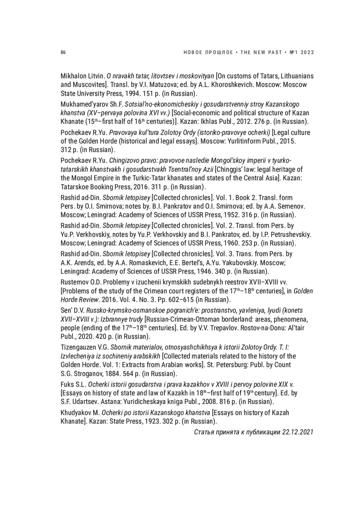 1. Акчурин М., Ишеев М., Абдиев А. Эпоха татарских князей в Мещере (XV-XVII века). Казань: Ин-т истории им. Ш. Марджани АН РТ, 2021. 316 с. EDN: AUYXQX