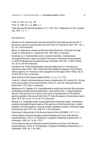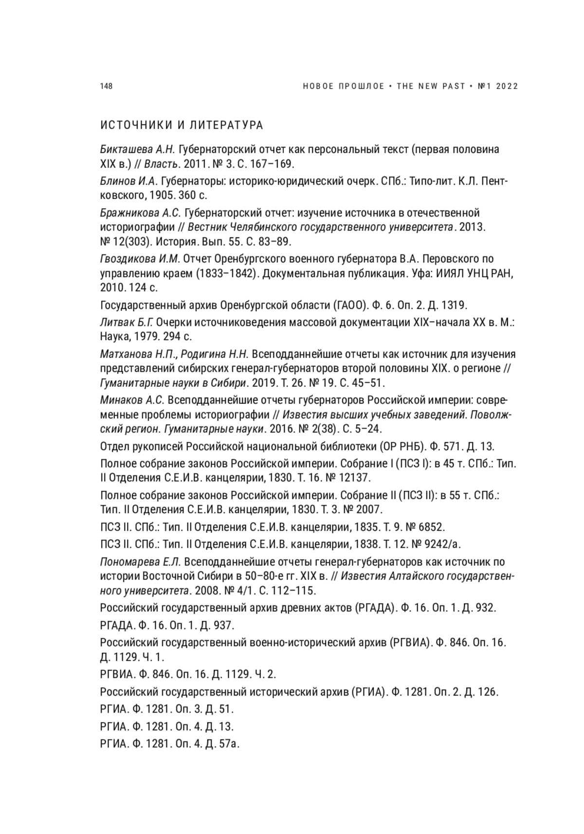 7. Матханова Н.П., Родигина Н.Н. Всеподданнейшие отчеты как источник для изучения представлений сибирских генерал-губернаторов второй половины XIX. о регионе // Гуманитарные науки в Сибири. 2019. Т. 26. № 19. С. 45-51.