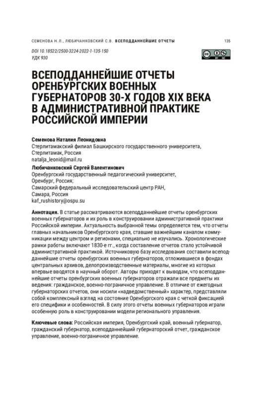 В статье рассматриваются всеподданнейшие отчеты оренбургских военных губернаторов и их роль в конструировании административной практики Российской империи. Актуальность выбранной темы определяется тем, что отчеты главных начальников Оренбургского края, ставшие важнейшим каналом коммуникации между центром и регионами, специально не изучались. Хронологические рамки работы включают 1830-е гг., когда составление отчетов стало устойчивой административной практикой. Источниковую базу исследования составили всеподданнейшие отчеты оренбургских военных губернаторов, отложившиеся в фондах центральных архивов, делопроизводственные материалы, многие из которых впервые вводятся в научный оборот. Авторы приходят к выводам, что всеподданнейшие отчеты оренбургских военных губернаторов отражали все предметы их ведения: гражданское, военно-пограничное управление. В отличие от ежегодных губернаторских отчетов, они носили «надведомственный» характер, представляли собой комплексный взгляд на состояние Оренбургского края с четкой фиксацией его специфики и особенностей. В силу этого отчеты военных губернаторов играли особенную роль в конструировании модели регионального управления