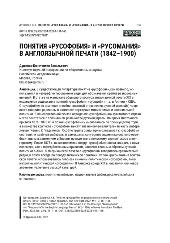 В существующей литературе понятие «русофобия», как правило, используется в неотрефлектированном виде, для обозначения крайне разнородных явлений. В статье на материале обширного корпуса англоязычной печати XIX в. исследуется содержание понятий «русофобия», «русофоб» и т. д. в Англии и США. О «русофобии» (в значении «необоснованный страх перед русской угрозой») чаще всего говорили радикалы в контексте осуждения милитаризма и колониальной политики. В консервативной печати осуждение «русофобии» как фантомного страха могло сочетаться с признанием реальности русской угрозы. Во время Восточного кризиса 1876–1878 гг. и позже «русофобами» именовались по преимуществу тори, а в качестве критиков «русофобии» выступала наиболее влиятельная часть либералов во главе с У. Гладстоном. Особую группу среди причислявшихся к «русофобам» составляли идейные либералы и демократы, сочувствовавшие национально-освободительным движениям в Европе, прежде всего польскому, итальянскому и венгерскому. После 1878 г. накал полемики вокруг «русофобии» снова спадает, а сама полемика, как и перед Восточным кризисом, касается главным образом русской политики в Азии. В американской печати о «русофобии» говорилось сравнительно редко, и почти всегда по поводу английской политики. Слово «русомания» в британской печати использовалось либо как синоним политической «русофобии», либо, напротив, политической «русофилии». В Америке конца XIX в. оно получило новое значение: увлечение русской культурой