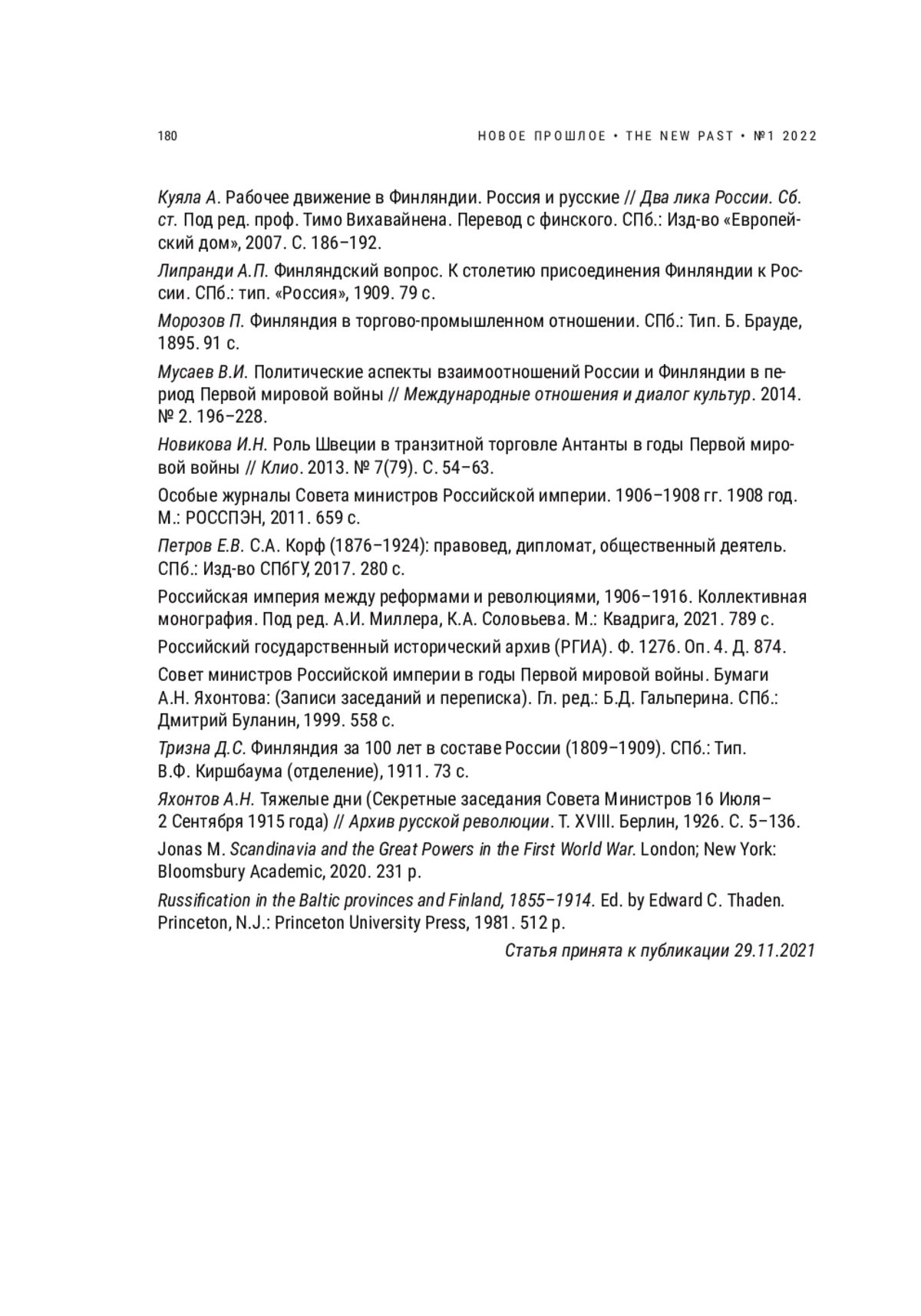 9. Дубровская Е.Ю. Влияние русского “военного фактора” на жизнь населения Финляндии: заключительный период финляндской автономии // Труды кафедры истории Нового и новейшего времени. 2020. № 20-1. С. 20-35. EDN: FBFGFZ