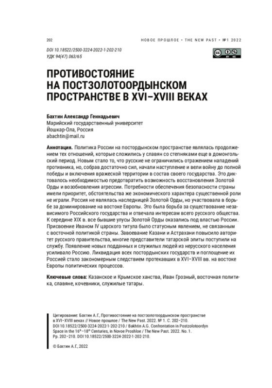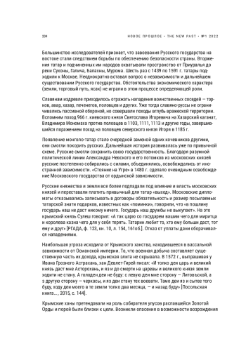 Проблема «золотоордынского наследия» в истории России, технологии инкорпорации иноверцев в состав православного Русского государства продолжают оставаться актуальными вопросами отечественной историографии. Обращение к работам исследователей и анализ источников позволяют высказать сомнение в обусловленности российской экспансии в восточном и южном направлениях лишь стремлением к обладанию бывшими владениями Улуса Джучи для повышения своего престижа. Внешняя политика России в этих направлениях прежде всего была связана с текущими потребностями государства. Умелое использование российским правительством татарских технологий осуществления власти, понятных для покоренных народов, ранее находившихся под властью Джучидов, способствовало довольно быстрому распространению среди большинства из них представлений о своем российском подданстве и о русском монархе как их законном государе. Значимую роль в распространении этой идеи среди новых подданных играла прослойка служилых татар. Особое положение Крымского ханства среди прочих татарских юртов, обусловленное османским протекторатом, продлило время существования этого государства, но не спасло его от поглощения Россией. Падение Крымского ханства не было предопределено изначально, однако сложившаяся к концу XVIII в. ситуация сделало это неизбежным