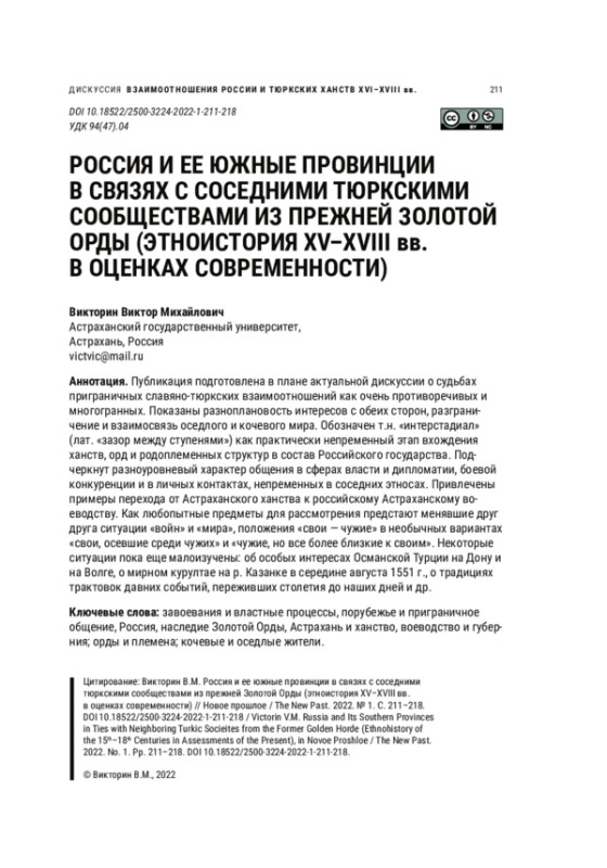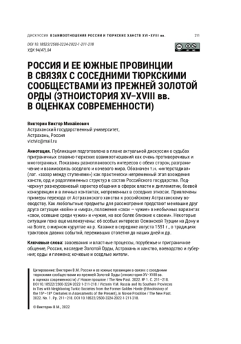 Публикация подготовлена в плане актуальной дискуссии о судьбах приграничных славяно-тюркских взаимоотношений как очень противоречивых и многогранных. Показаны разноплановость интересов с обеих сторон, разграничение и взаимосвязь оседлого и кочевого мира. Обозначен т. н. «интерстадиал» (лат. «зазор между ступенями») как практически непременный этап вхождения ханств, орд и родоплеменных структур в состав Российского государства. Подчеркнут разноуровневый характер общения в сферах власти и дипломатии, боевой конкуренции и в личных контактах, непременных в соседних этносах. Привлечены примеры перехода от Астраханского ханства к российскому Астраханскому воеводству. Как любопытные предметы для рассмотрения предстают менявшие друг друга ситуации «войн» и «мира», положения «свои — чужие» в необычных вариантах «свои, осевшие среди чужих» и «чужие, но все более близкие к своим». Некоторые ситуации пока еще малоизучены: об особых интересах Османской Турции на Дону и на Волге, о мирном курултае на р. Казанке в середине августа 1551 г., о традициях трактовок давних событий, переживших столетия до наших дней и др