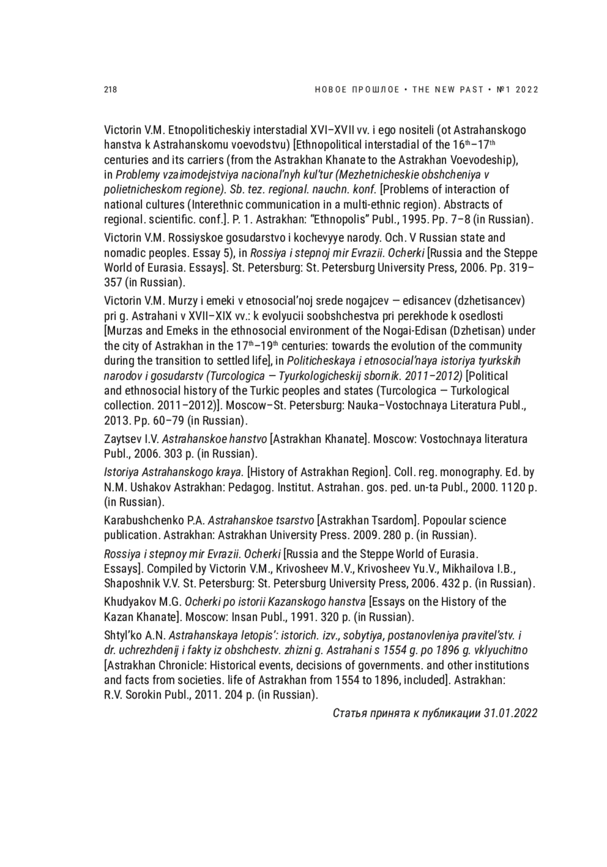 2. Викторин В.М. Этнополитический интерстадиал XVI-XVII вв. и его носители (от Астраханского ханства к Астраханскому воеводству) // Проблемы взаимодействия национальных культур (Межэтнические общения в полиэтническом регионе). Сб. тез. регионал. научн. конф. Ч. I. Астрахань: Общ-во и издат-во “Этнополис”, 1995. С. 7-8.