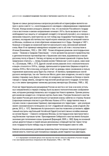 Одним из самых дискуссионных вопросов российской историографии является вопрос о роли и месте т. н. «золотоордынского наследия» в формировании современной России. Иногда можно услышать мнение о том, что экспансия Российского государства в восточном и южном направлениях начиная с XVI в. была вызвана не только необходимостью защиты от нападений соседей («татарской угрозой»), но и связана с желанием повысить свой престиж за счет побед над государями-Чингисидами. Безусловно, последнее обстоятельство порой играло немалую роль во внешней политике Москвы, особенно на этапе обретения независимости от Орды. Овладев в 1487 г. Казанью и посадив на казанский престол вассального хана, московский великий князь Иван III не преминул немедленно направить весть об этом с посольством в Италию [Базилевич, 1952, с. 204–205] 1. Позже обладание доменом золотоордынских ханов — Нижним и Средним Поволжьем — стало аргументом русского правительства в дипломатическом противоборстве с Крымским ханством, выраженным в наказе русскому послу в Крым А. Нагому, которому на притязания крымской стороны было предписано отвечать: «… теперь Божиею волею Узбеков юрт у кого в руках, сами знаете…» [Соловьев, 1989, с. 577