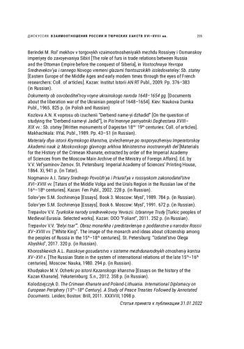 13. Kolodziejczyk D. The Crimean Khanate and Poland-Lithuania. International Diplomacy on European Periphery (15th - 18th Century). A Study of Peace Treaties Followed by Annotated Documents. Leiden; Boston: Brill, 2011. XXXVIII, 1098 p.