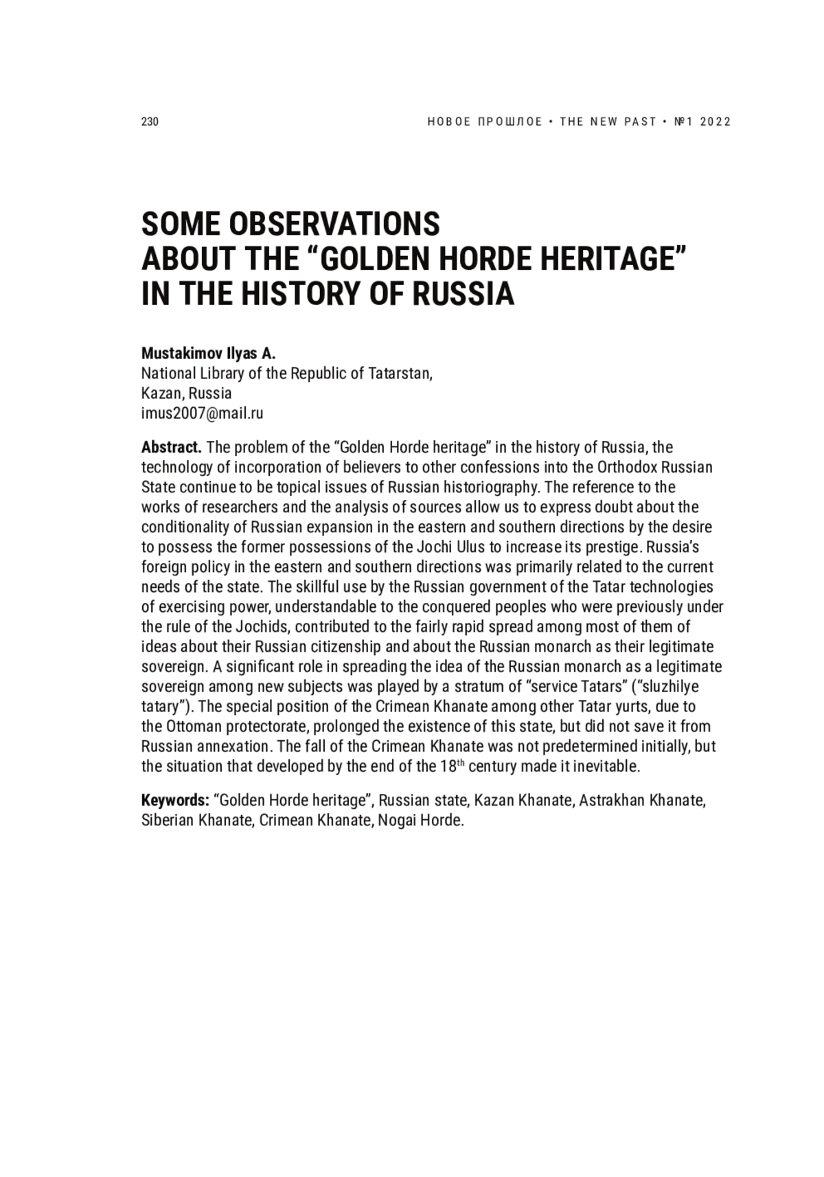 Проблема «золотоордынского наследия» в истории России, технологии инкорпорации иноверцев в состав православного Русского государства продолжают оставаться актуальными вопросами отечественной историографии. Обращение к работам исследователей и анализ источников позволяют высказать сомнение в обусловленности российской экспансии в восточном и южном направлениях лишь стремлением к обладанию бывшими владениями Улуса Джучи для повышения своего престижа. Внешняя политика России в этих направлениях прежде всего была связана с текущими потребностями государства. Умелое использование российским правительством татарских технологий осуществления власти, понятных для покоренных народов, ранее находившихся под властью Джучидов, способствовало довольно быстрому распространению среди большинства из них представлений о своем российском подданстве и о русском монархе как их законном государе. Значимую роль в распространении этой идеи среди новых подданных играла прослойка служилых татар. Особое положение Крымского ханства среди прочих татарских юртов, обусловленное османским протекторатом, продлило время существования этого государства, но не спасло его от поглощения Россией. Падение Крымского ханства не было предопределено изначально, однако сложившаяся к концу XVIII в. ситуация сделало это неизбежным