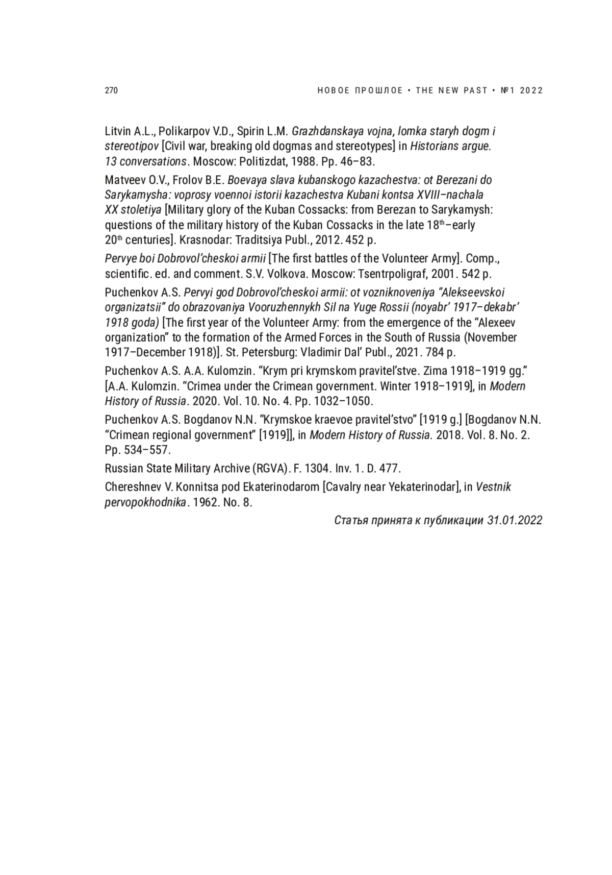 10. Пученков А.С. Первый год Добровольческой армии: от возникновения “Алексеевской организации” до образования Вооруженных Сил на Юге России (ноябрь 1917-декабрь 1918 года). СПб.: Владимир Даль, 2021. 784 с. EDN: WORRNQ