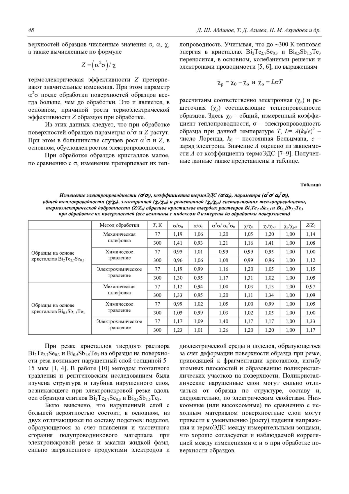 Абдинов Д. Ш., Алиева Т. Д., Ахундова Н. М., Абдинова Г. Д., Тагиев М. М., Бархалов Б. Ш. Влияние поверхностного нарушенного слоя на термоэлектрические свойства кристаллов Bi2Te2.7Se0.3, Bi0.5Sb1.5Te3 и термоэлементов на их основе 47