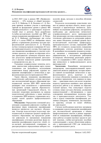 Проблема исследования и обоснование ее актуальности. Обсуждается проблема содержания повышения квалификации преподавателей СПО посредством рефлексии и других форм работы с целью личностного и профессионального роста в Свердловской области. Развитие рефлексии и ее диагностика у преподавателей СПО позволит критически оценивать свои действия, результаты работы и их влияние на образовательный процесс. Подчеркивается необходимость отслеживания развития рефлексии и уровня повышения квалификации преподавателей разных возрастных групп с целью обеспечения личностного и профессионального роста с применением различных тестирующих методик. В структуру исследования рефлексии вошли семь критериев и их диагностика. Автор кратко описывает их составляющие. Итоговой диагностикой является проверка «Уровня стремления к саморазвитию преподавателей».