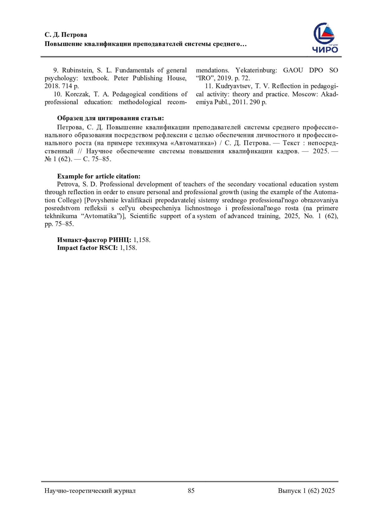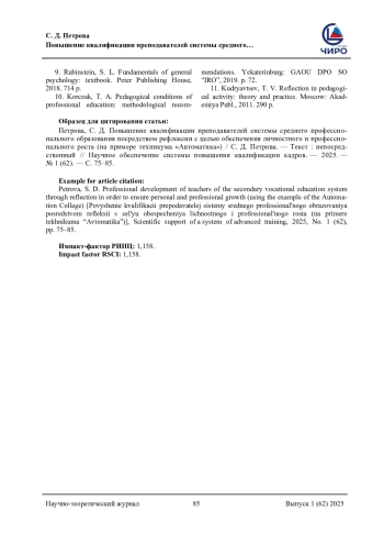 1. Игнатьева, Г. А. “Самообучающаяся организация” как модель повышения квалификации педагога / Г. А. Игнатьева. - Текст: непосредственный // Высшее образование в России. - 2005. - № 9. - С. 56-60. EDN: IBNGTH