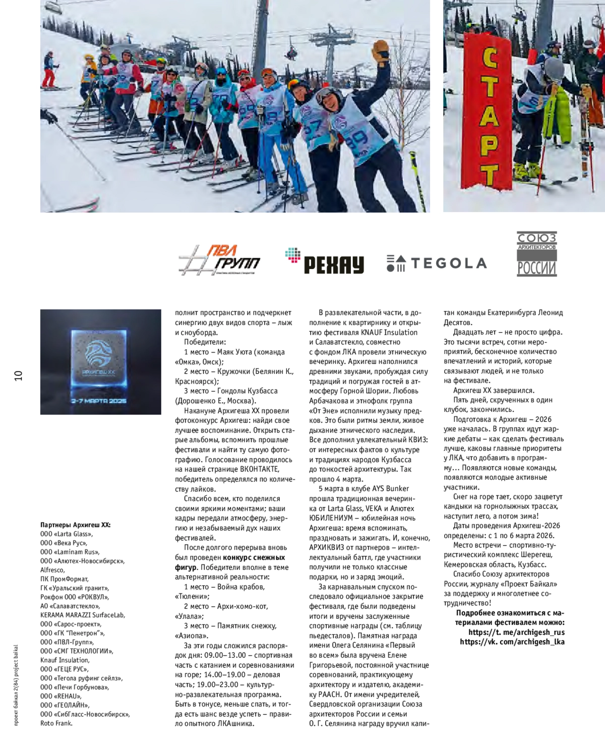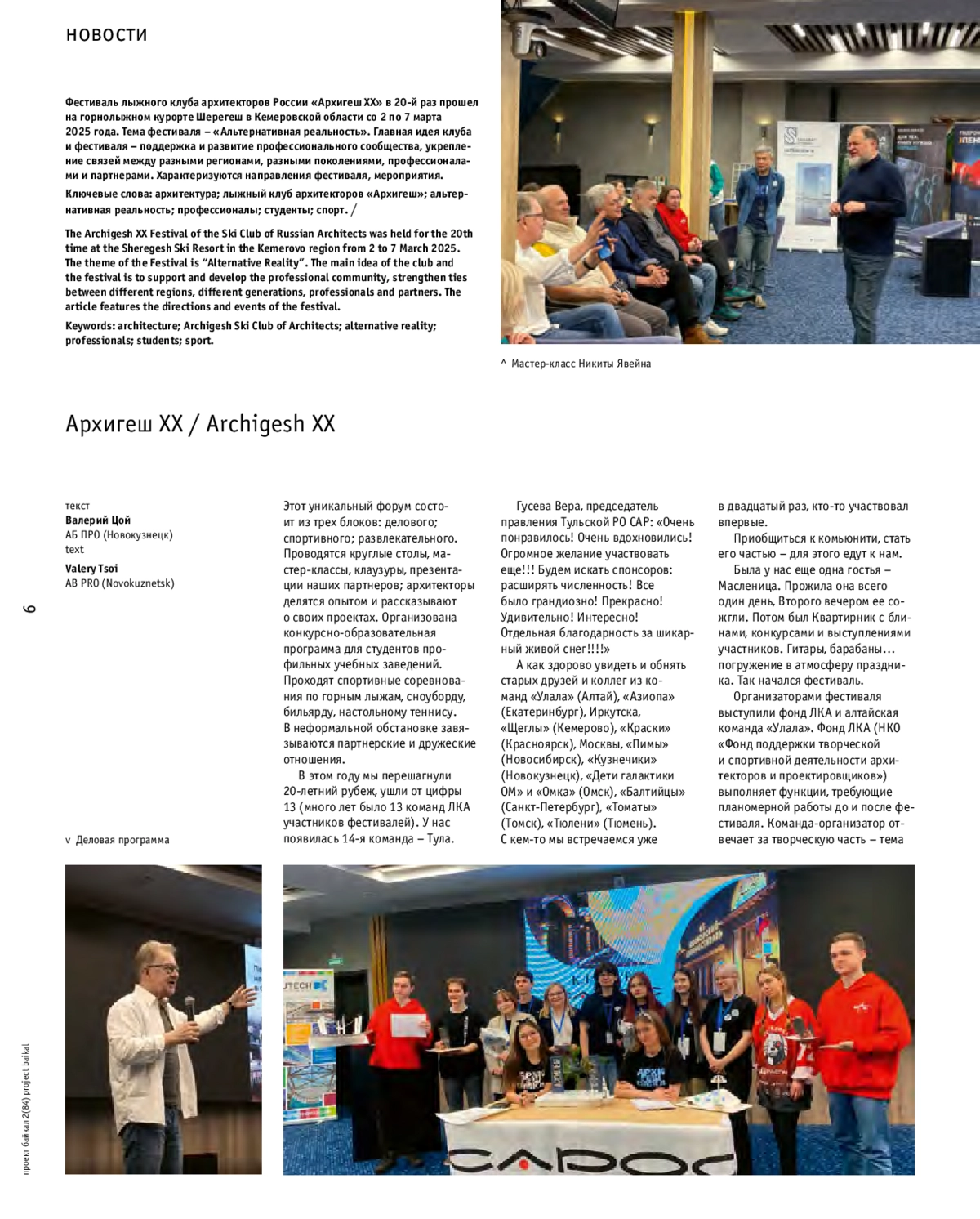 Фестиваль лыжного клуба архитекторов России «Архигеш ХХ» в 20-й раз прошел на горнолыжном курорте Шерегеш в Кемеровской области со 2 по 7 марта 2025 года. Тема фестиваля - «Альтернативная реальность». Главная идея клуба и фестиваля - поддержка и развитие профессионального сообщества, укрепление связей между разными регионами, разными поколениями, профессионалами и партнерами. Характеризуются направления фестиваля, мероприятия.