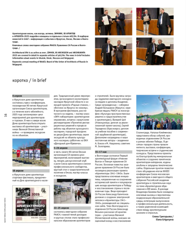 Архитектурная жизнь, как всегда, активна. ЗИМНИК, ХХ АРХИГЕШ и АРХБУХТА-2025 подробно освещены в отдельных статьях пб2/84. В подборке новостей in brief - информация о событиях в Иркутске, Омске, Москве и Волгограде.