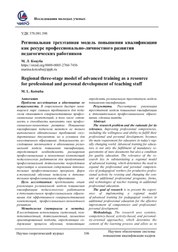 Проблема исследования и обоснование ее актуальности. В современном быстро меняющемся мире главным требованием для педагогов становится совершенствование профессиональных компетенций, в том числе готовность и способность выполнять свое профессионально-личностное развитие. Повышение квалификации педагогов является не только выполнением обязательных требований государственных документов, но и условием для качественного образования. Актуальность исследования заключается в обосновании региональной модели повышения квалификации, определяющей необходимость расширения профессиональных и личностных компетенций педагогических работников для продуктивной профессиональной деятельности посредством пересмотра и изменения содержания дополнительных профессиональных программ, форм и технологий обучения педагогов в дополнительном профессиональном образовании. Цель исследования: представить опыт реализации региональной модели повышения квалификации педагогических работников в дополнительном профессиональном образовании для эффективного совершенствования компетенций, профессионально-личностного развития. Методология (материалы и методы). В исследовании использованы системный, компетентностный, деятельностный, личностно ориентированный подходы, определяющие содержание процесса обучения, позволяющие определить региональную трехэтапную модель повышения квалификации. Результаты. Рассмотрена реализация трехэтапной модели повышения квалификации в дополнительном профессиональном образовании, сделаны выводы.