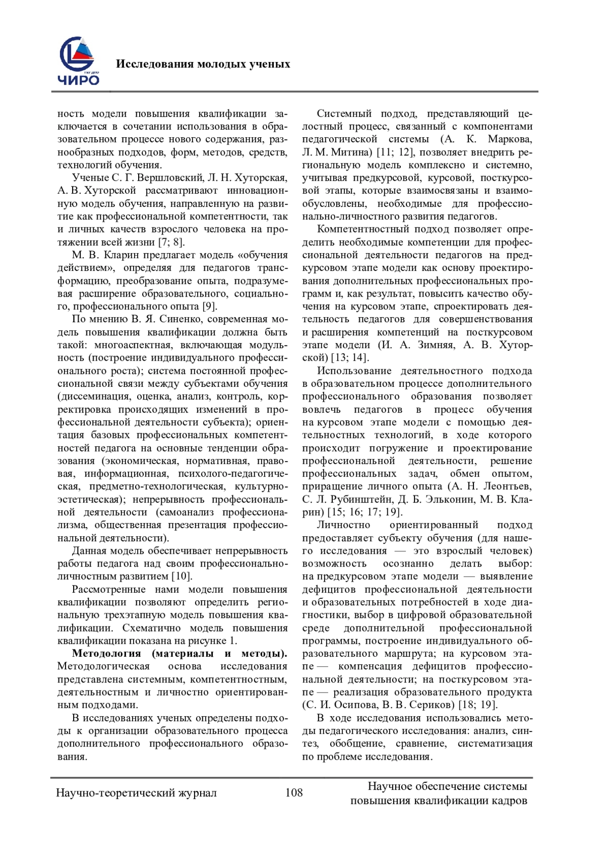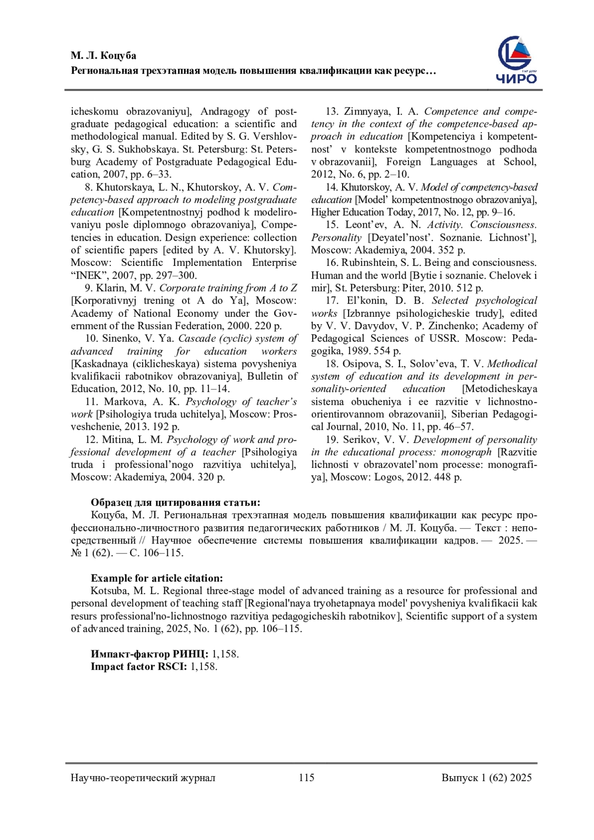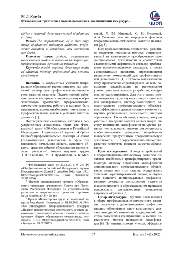 5. Коцуба, М. Л. Дополнительное профессиональное образование: региональная модель повышения квалификации / М. Л. Коцуба. - Текст: непосредственный // Актуальные проблемы науки и образования в условиях современных вызовов: сборник материалов XVII Международной научно-практической конференции, Москва, 27 декабря 2022 года. - Москва: Печатный цех, 2022. - С. 86-89. EDN: BOEARC