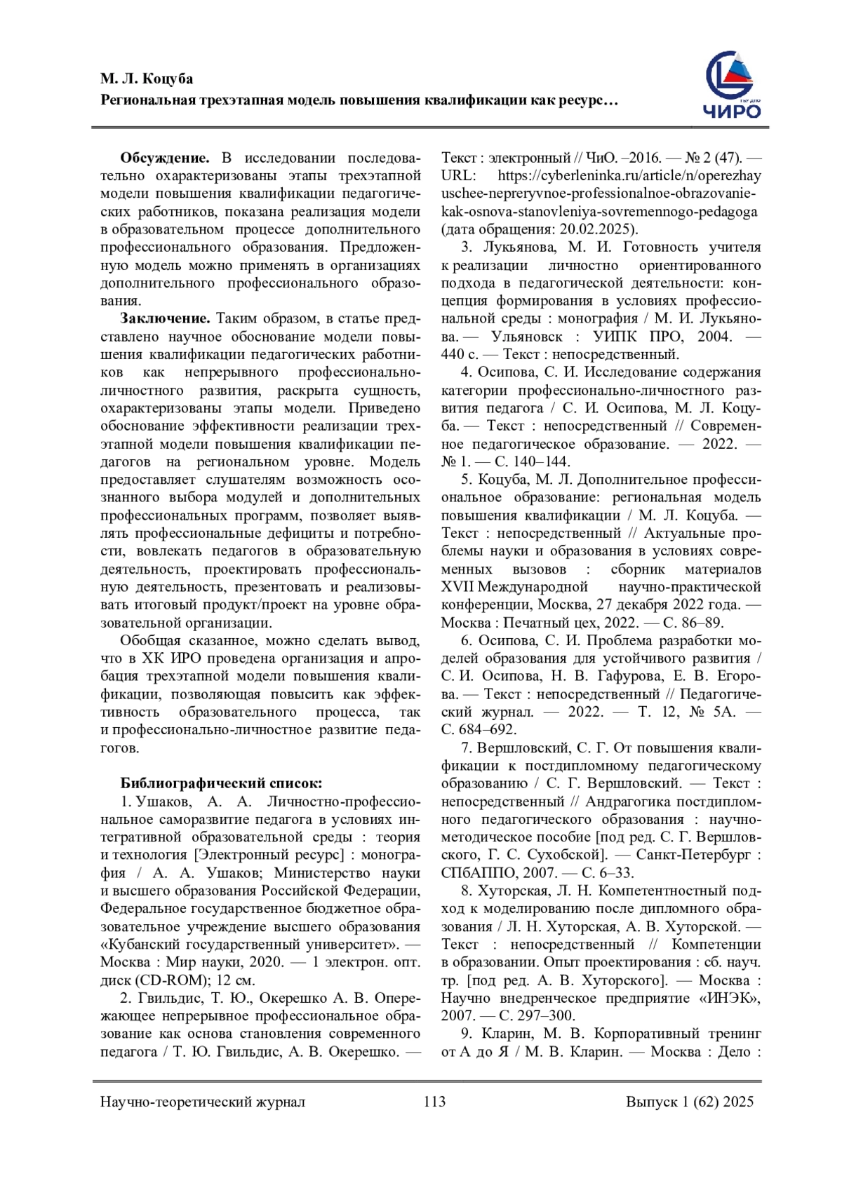 4. Осипова, С. И. Исследование содержания категории профессионально-личностного развития педагога / С. И. Осипова, М. Л. Коцуба. - Текст: непосредственный // Современное педагогическое образование. - 2022. - № 1. - С. 140-144. EDN: WLQUYO