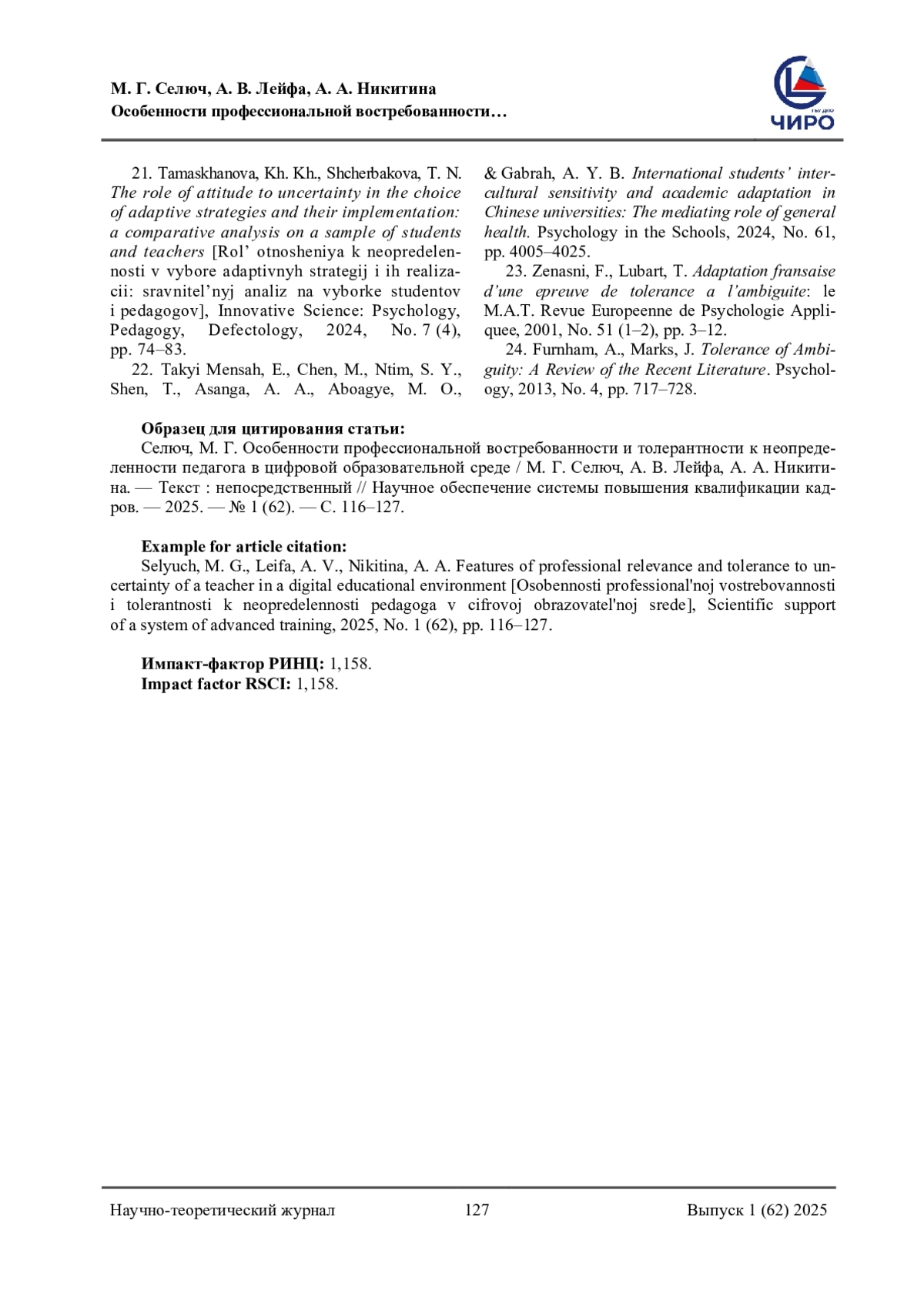 11. Селюч, М. Г. Влияние толерантности к неопределенности на профессиональную деятельность педагога / М. Г. Селюч. - Текст: непосредственный // Сборник научных трудов Всероссийской научно-практической конференции “Актуальные проблемы адаптации курсантов и слушателей образовательных организаций МВД России к условиям профессиональной деятельности”. - Москва: Московский университет МВД РФ им. В. Я. Кикотя, 2024. - С. 340-342. EDN: HMOLZR