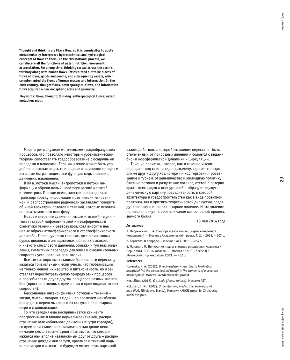 Многозначное понятие «поток» связано с движением в пространстве и во времени, перемещением в одном направлении неких сущностей. Таков город - иерархическая управляемая открытая система, обеспечивающая на ограниченной территории взаимодействие многих материальных и виртуальных потоков. Но таковы и все другие архитектурные объекты, все организованности проектной мысли. Однако каково реальное соответствие наших привычных представлений понятию потока, формируемому в иных областях знания, занятых этим понятием не эпизодически, но постоянно? В том числе и в критически ориентированном методологическом знании в архитектурно-проектной сфере? На эти вопросы пытаются ответить авторы статьи.