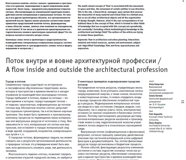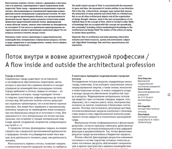Ключевые фразы: поток в архитектуре и градостроительстве, взаимодействие, материальные и виртуальные ресурсы, система и среда, предметное и «распредмеченое» знание, поток и форма, выражение и экспрессия