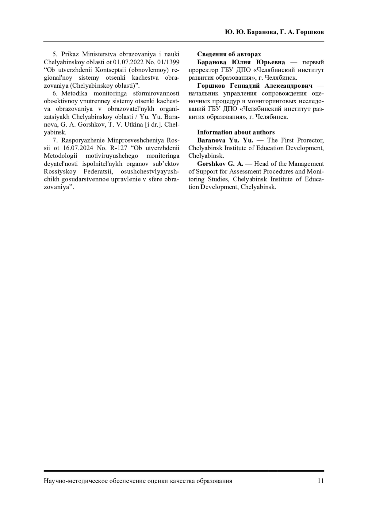 6. Методика мониторинга сформированности объективной внутренней системы оценки качества образования в образовательных организациях Челябинской области / Ю. Ю. Баранова, Г. А. Горшков, Т. В. Уткина [и др.]. - Челябинск:ЧИРО,2023.- 41 с.
