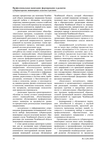 В статье актуализирована задача формирования инженерной культуры и развития инженерного образования обучающихся общеобразовательных организаций Челябинской области. Представлена краткая характеристика модели формирования и развития губернаторских инженерных классов. Раскрыто содержание работы губернаторских инженерных классов. Определены направления развития инженерного образования в системе образования Челябинской области.